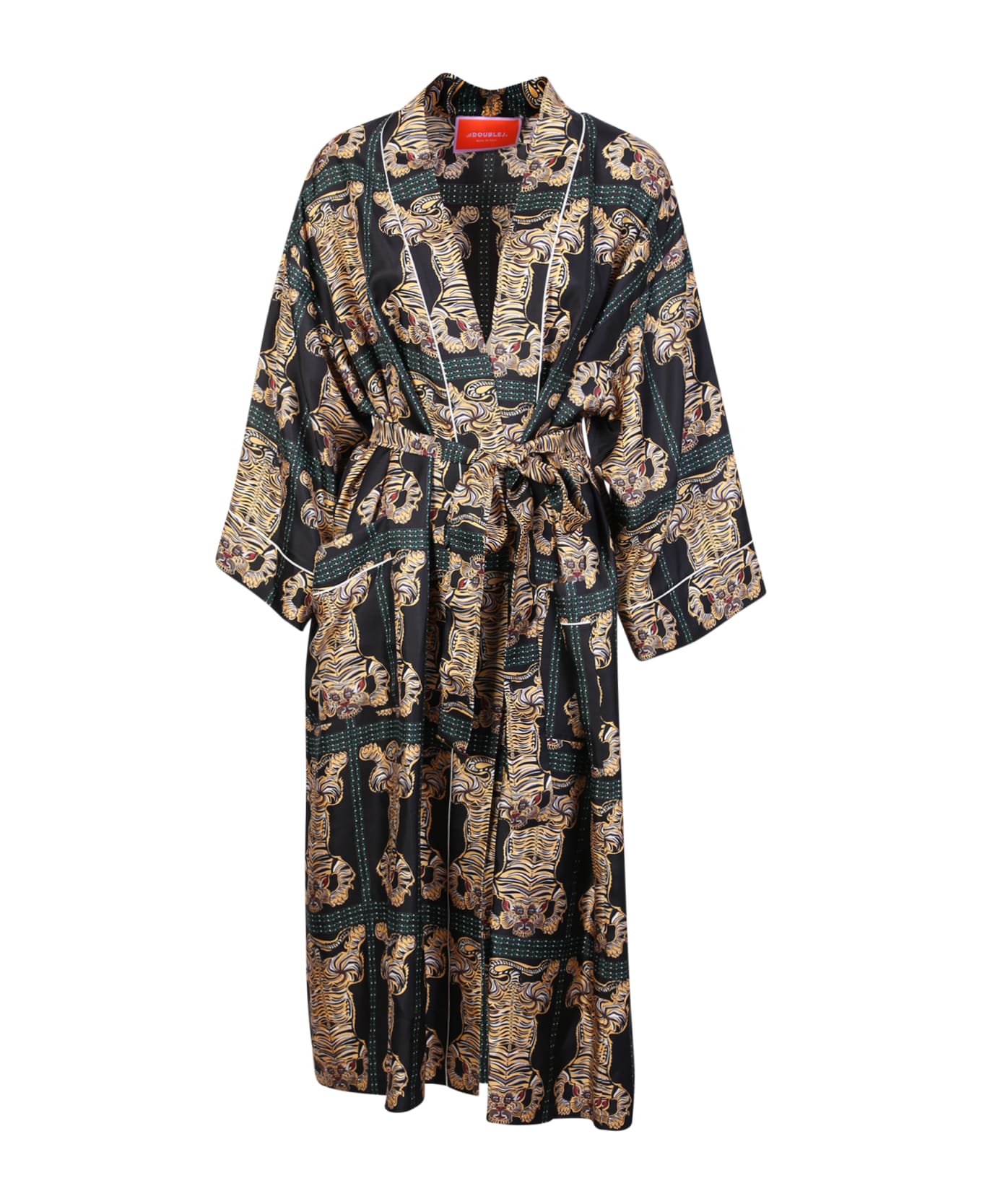 Shawl lapels. Long sleeves. Tiger print. Tied waist. Color: brown