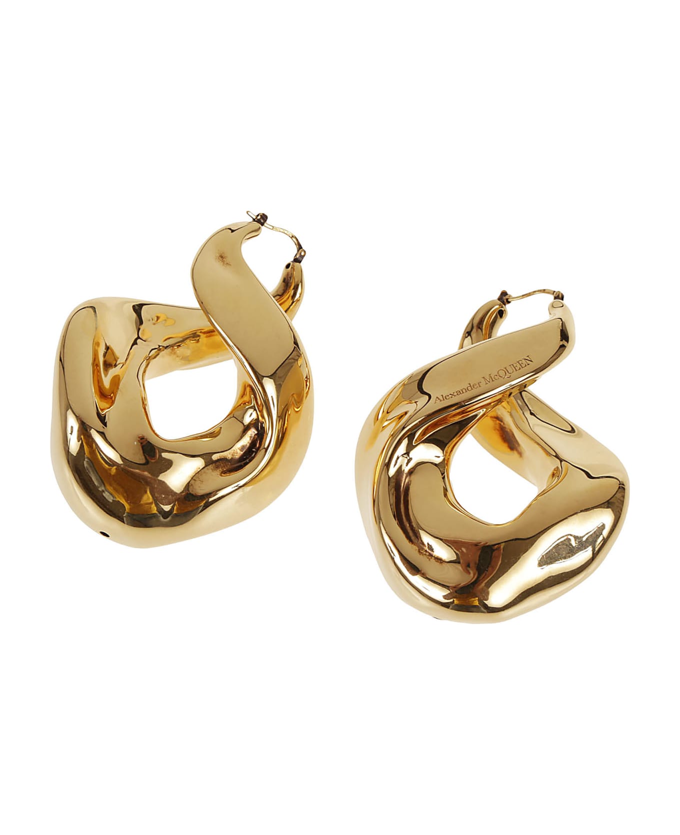 A pair of twisted hoop earrings by Alexander McQueen are made of gold-tone brass and feature a polished finish, twisted hoop design, engraved logo, hinge-pin fastening and are suitable for pierced ears.