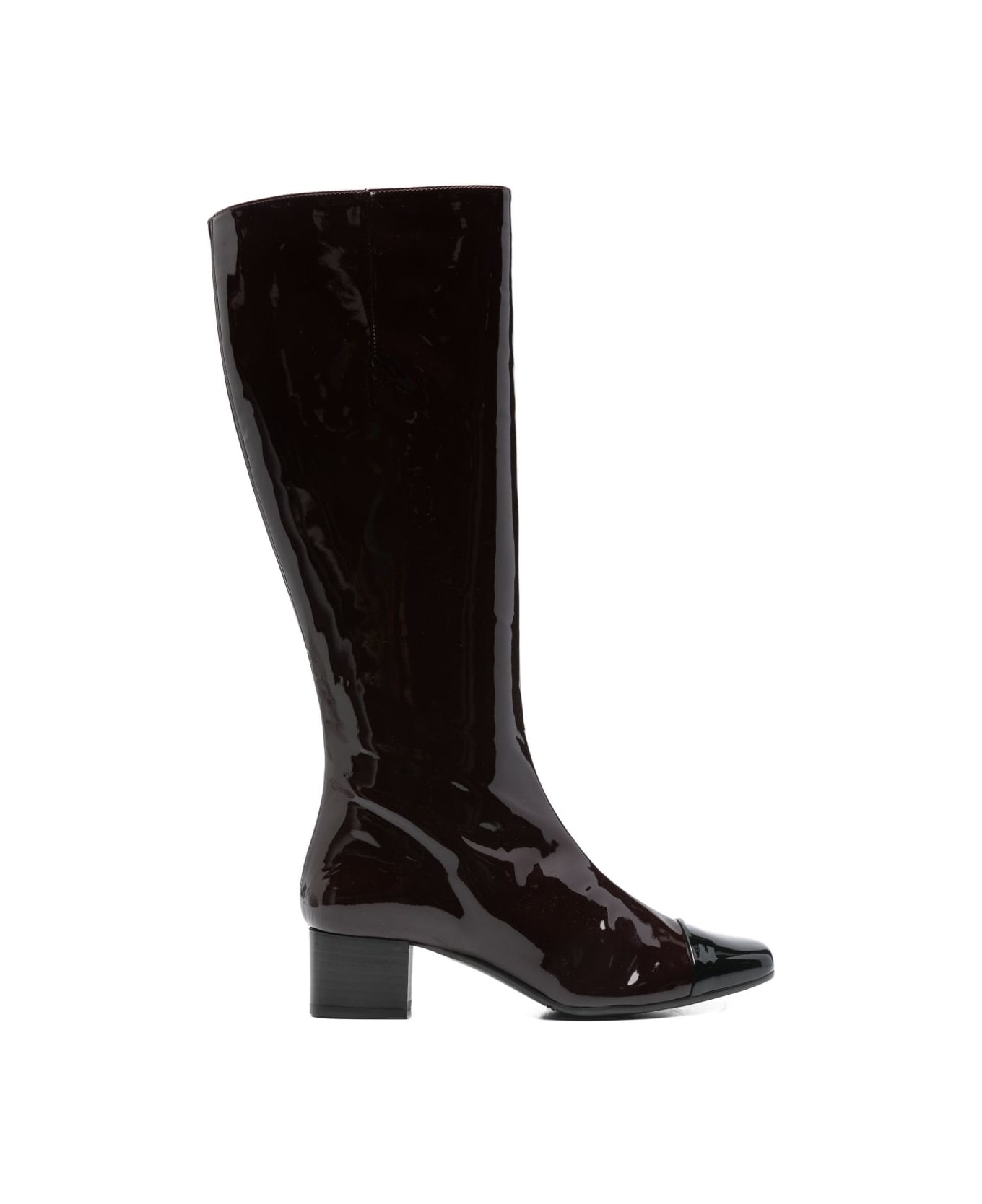 dark brown patent finish cap toe block heel side zip fastening knee-high