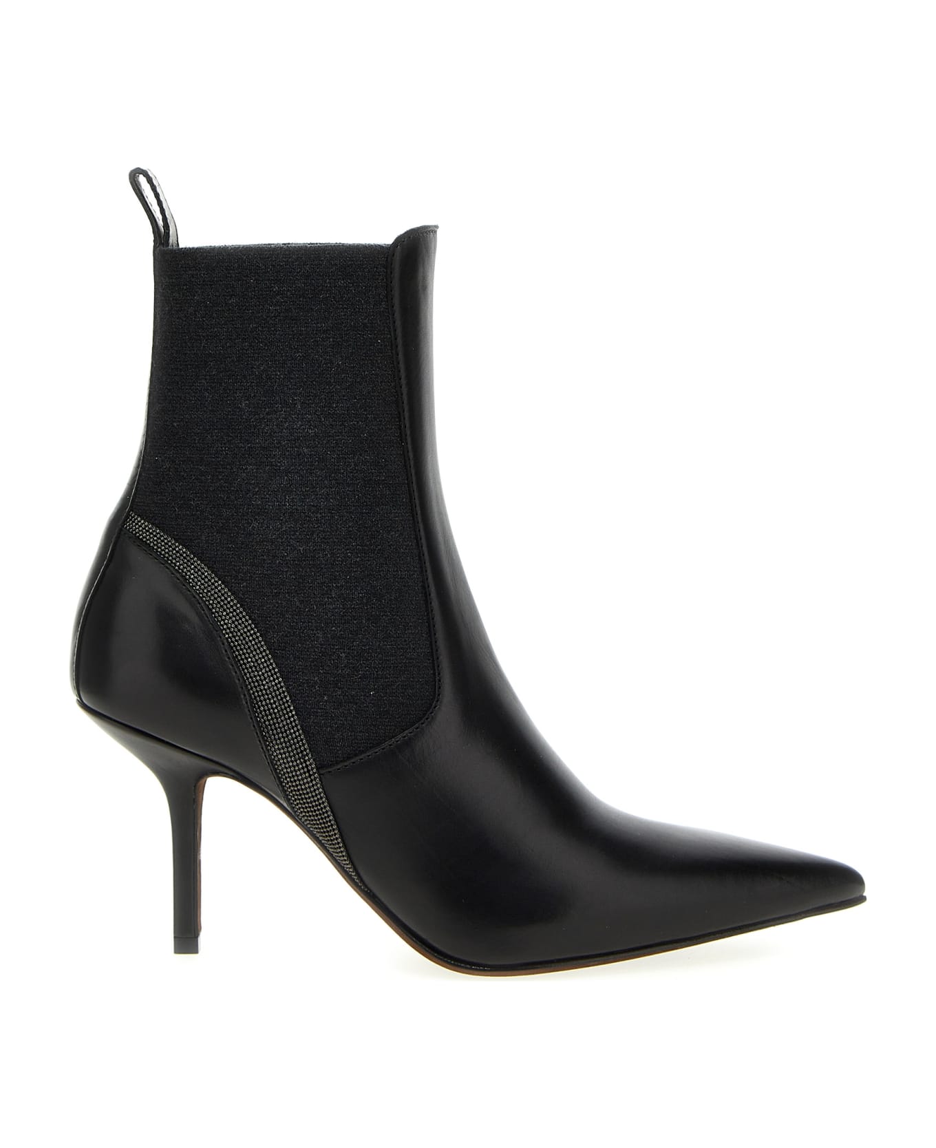 Leather ankle boots with elastic knit detail, and ankles bearing Monile, heel, and leather sole. Composition:
