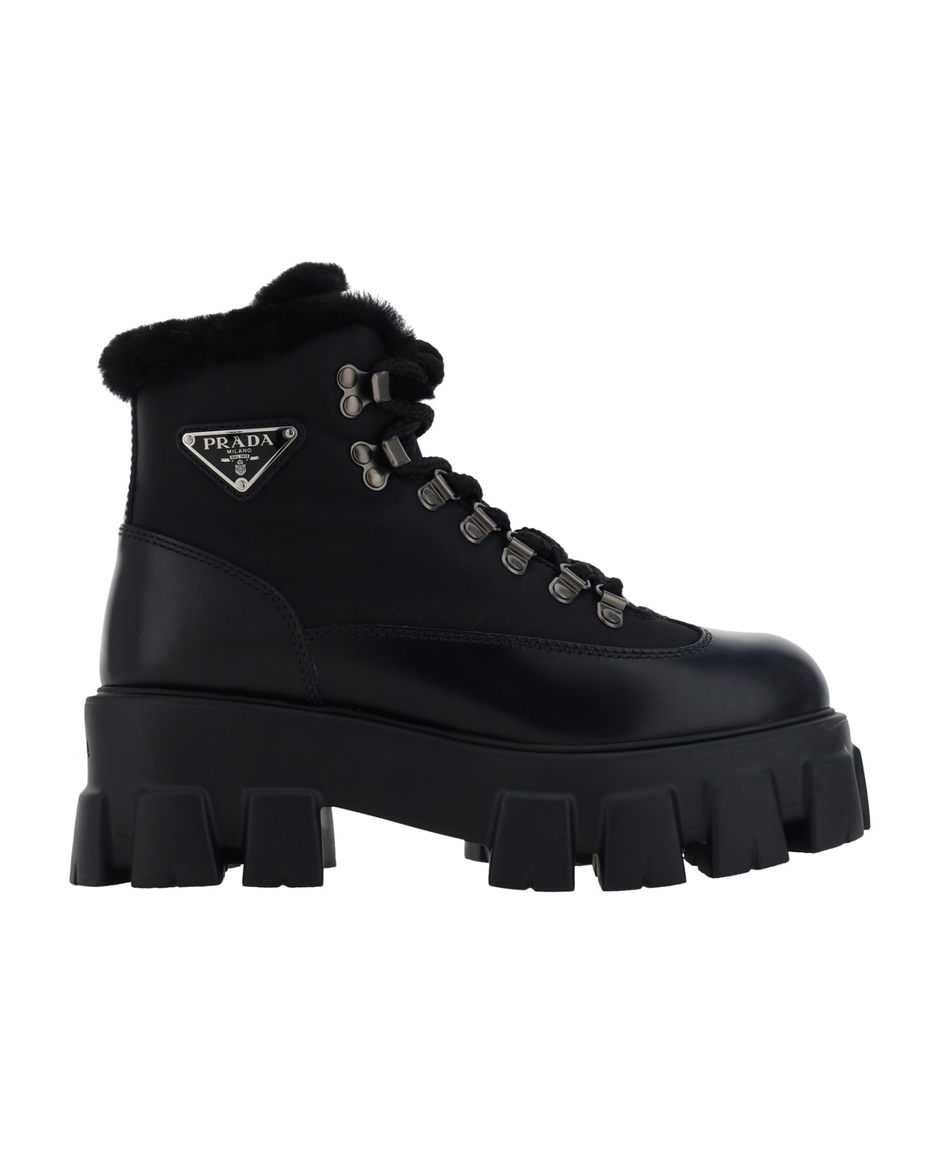 Calfskin monolith ankle boots by prada, rubber block heel and lug sole, front closure by laces, metal eyelets for closure by nylon laces, soft faux fur lining, iconic triangular enameled brand signature plaque applied on side panels. Composition: 100% % Calf Leather Bos Taurus, 100% % Rubber