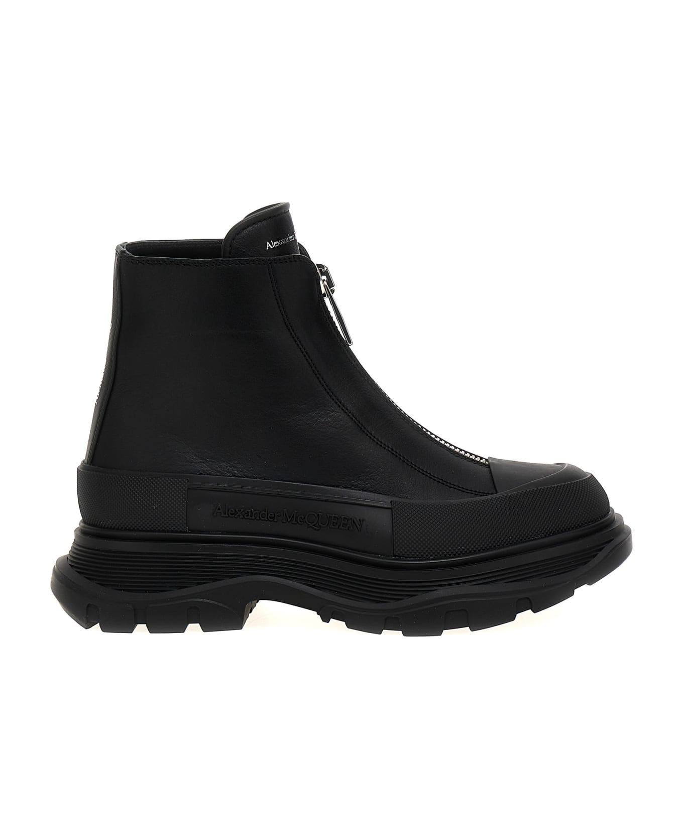 'Zip Tread Slick' leather ankle boots, front zip closure, oversized rubber sole.