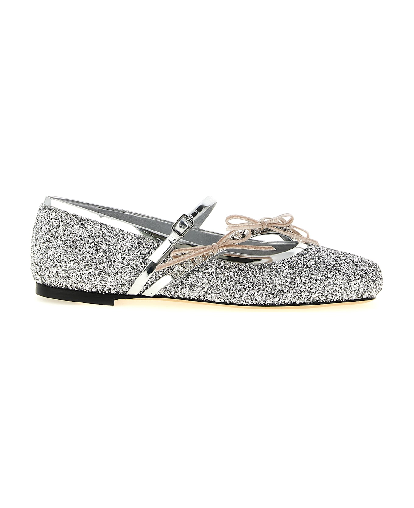 Loli' ballet flats in fabric with glitter powder and leather and satin details, oblique strap with crystals and satin bows, curled square toe, adjustable strap on the instep, leather and rubber sole. Composition: 70% tx 15% lh 5% sa 5% pt 5% me