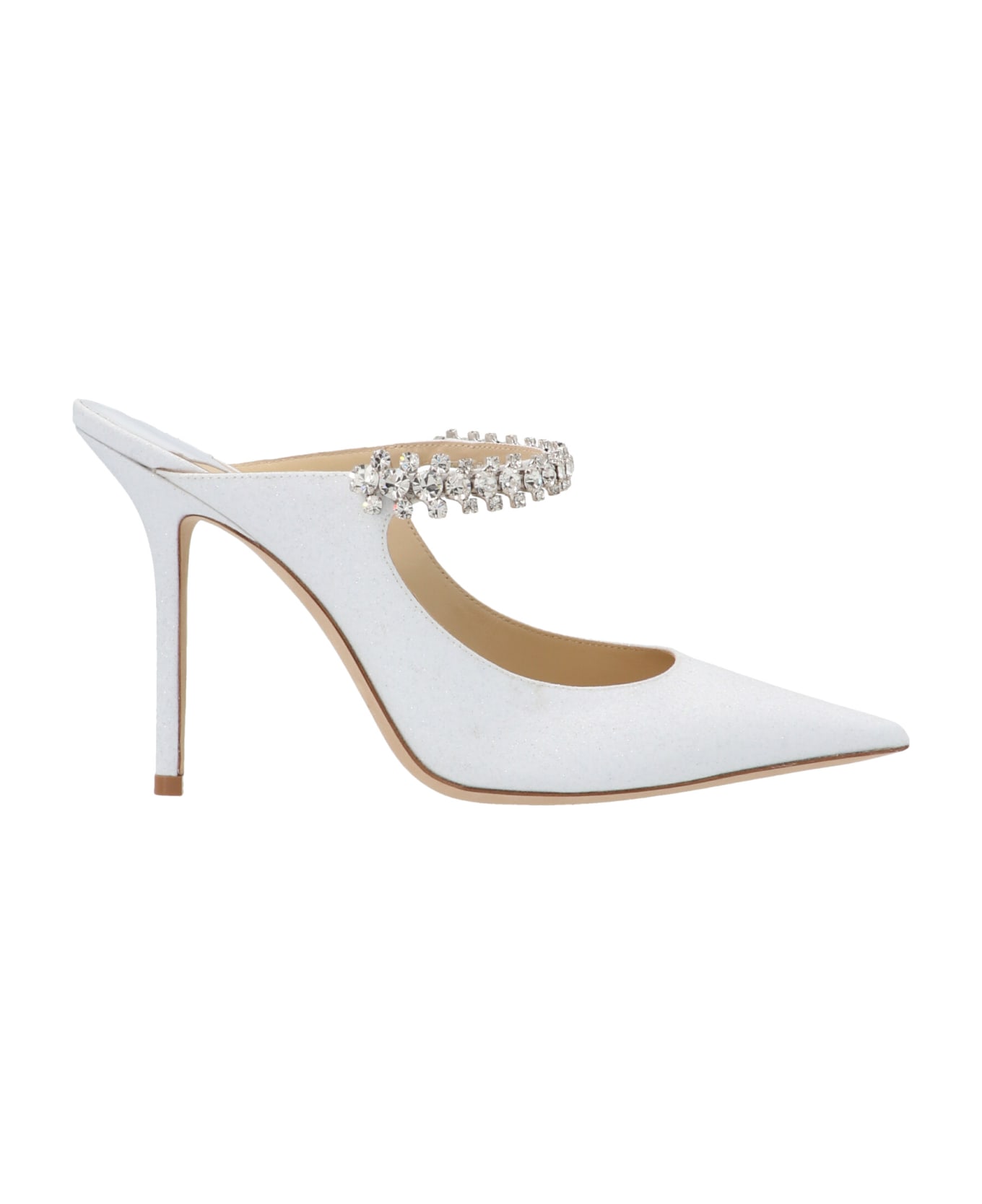 'Asymmetrical glitter fabric mules featuring a front jewel detail, a front pointed toe and stiletto heels. Composition: