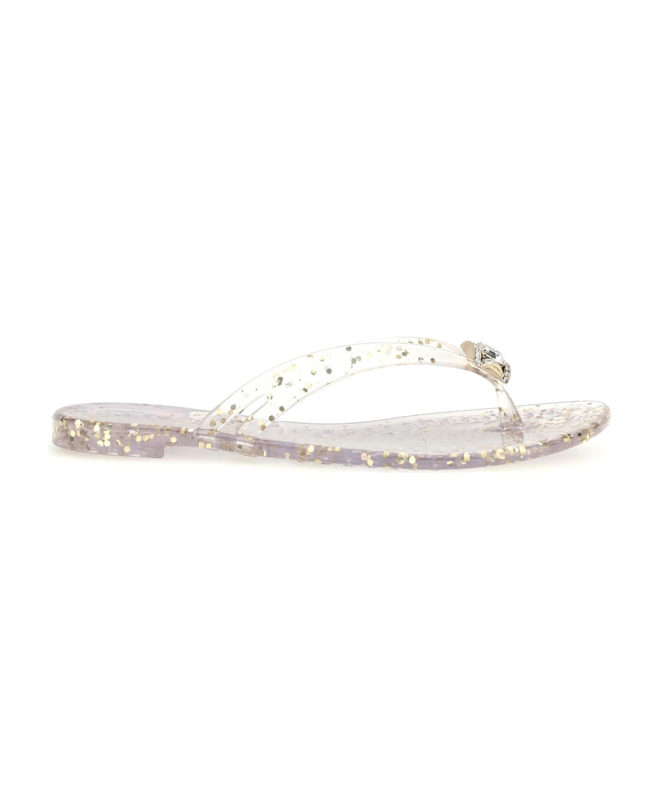 The glitter thong sandals by casadei are distinguished by a modern and bright design. the model, made of transparent rubber, features a flat sole that ensures comfort and practicality. the front clip detail embellished with rhinestones adds a bright and feminine touch, making the footwear ideal for enhancing even the most essential looks.