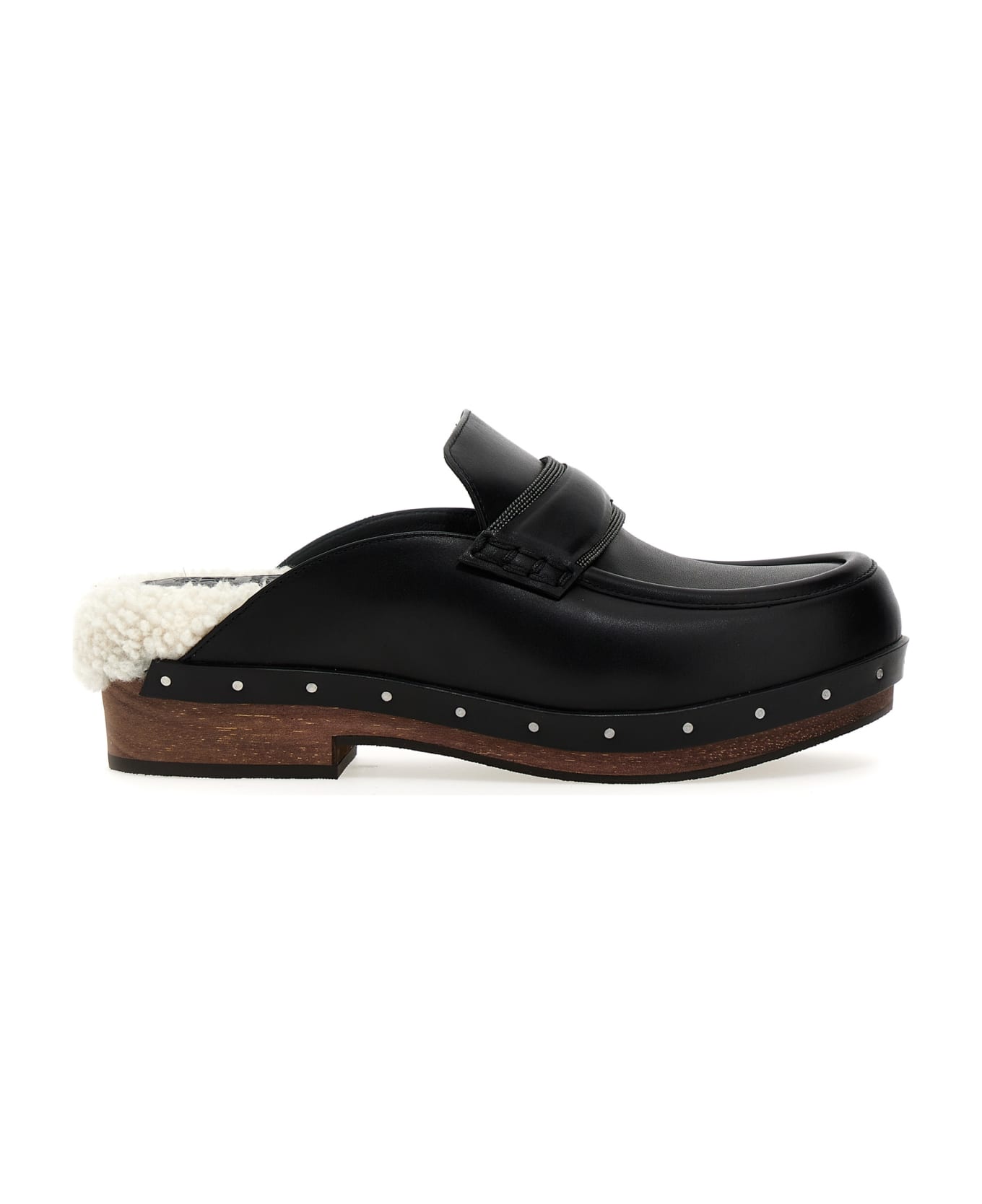 Leather clog with Monile detail on upper, shearling interior, wooden heel, and rubber sole. Composition: 100% leather