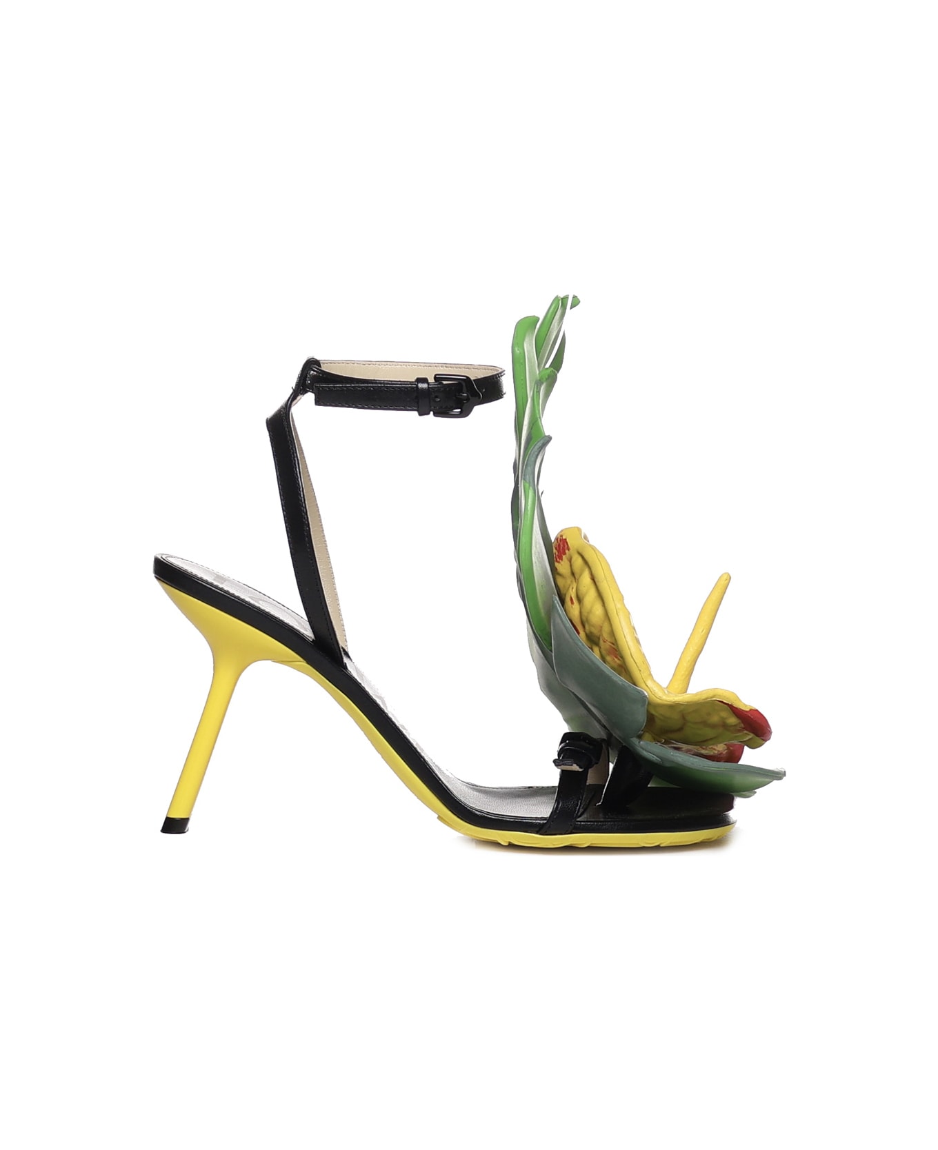 Black Petal Sandals from Loewe -Asymmetric heel sandals -Shiny lambskin with a monstera leaf and anthurium flower made in light foam rubber -Lacquered heel -Buckled ankle strap -Single buckled strap across the toe -Made in Italy -Colour: Black, Yellow, Green -100% Calfskin