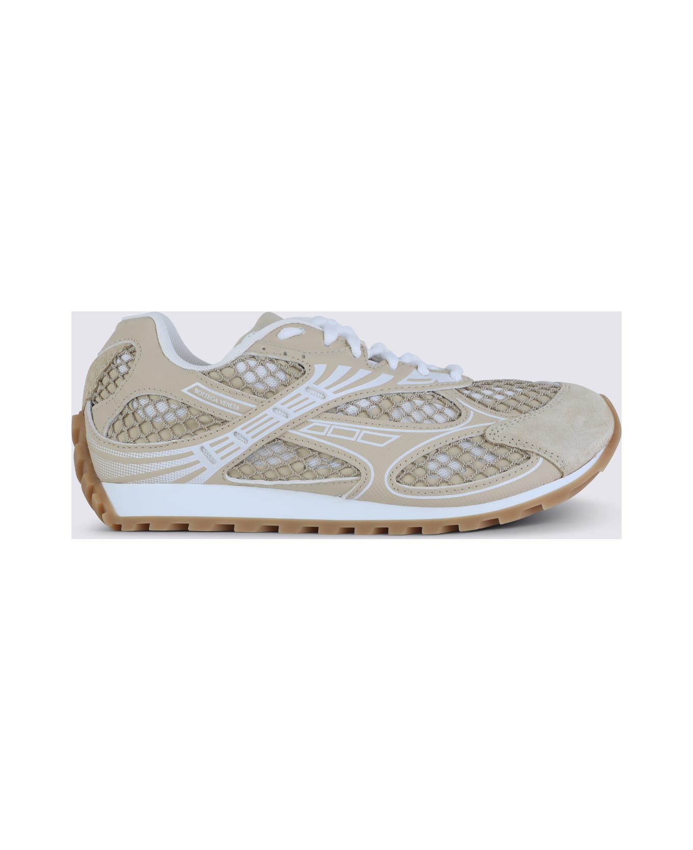 Beige leather Orbit sneakers from Bottega Veneta featuring round toe, cotton lace-up fastening, logo lable on the tongue, suede and mesh upper with fishnet inserts, rubber sole and contrasting outsole.