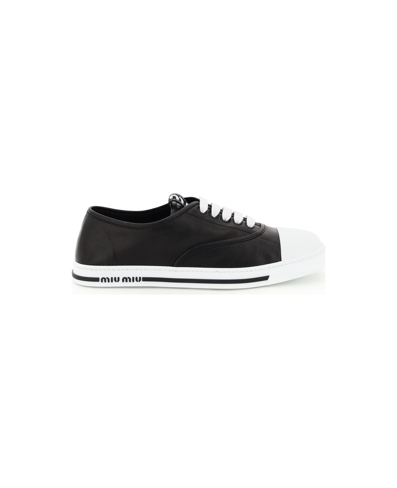 Miu Miu sneakers in soft nappa, featuring a belt loop with jacquard logo on the tongue. Toe covered in contrasting rubber, leather interior, rubber sole with contrasting insert and side logo, embossed star-shaped lugs on the bottom. Composition: 100% agnello
