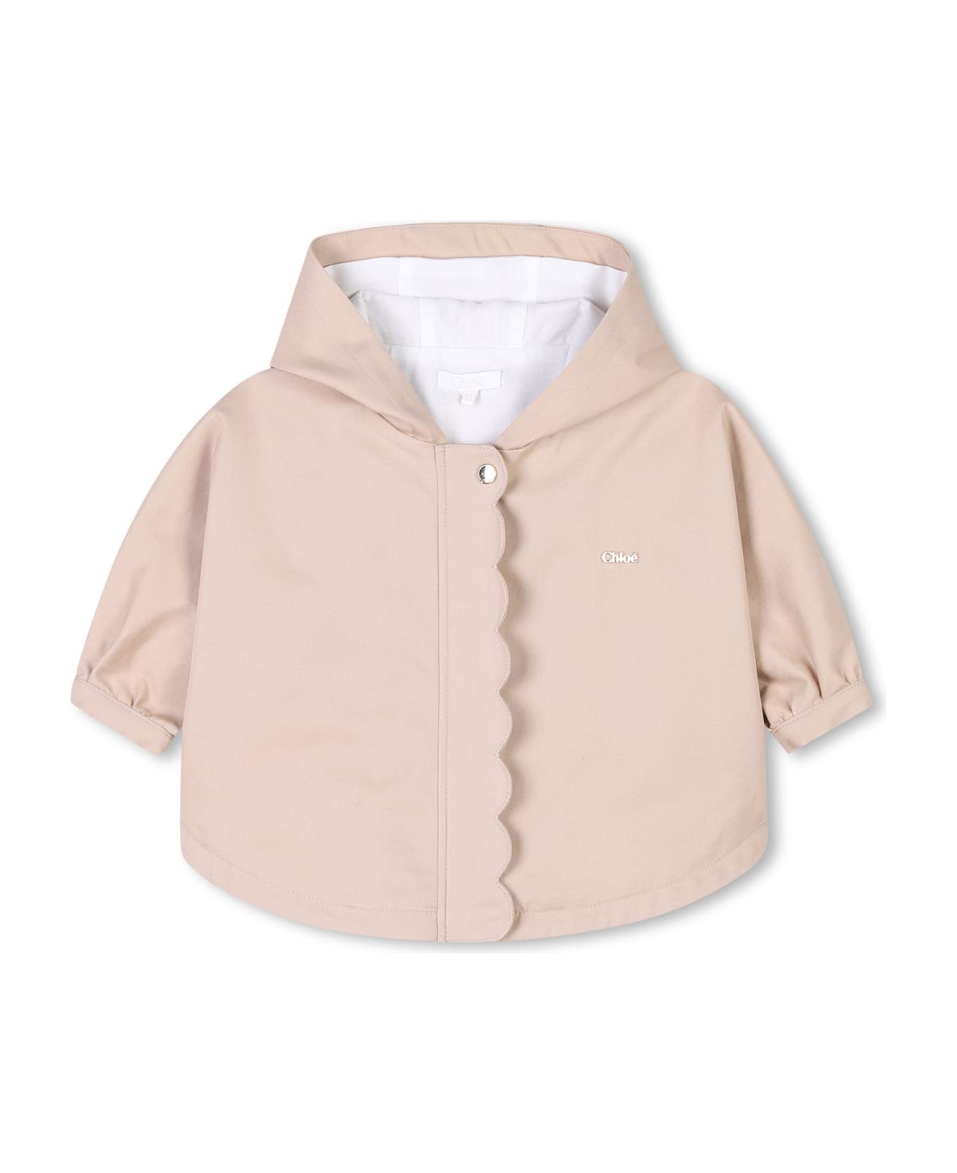 beige cotone tessuto in gabardine cappuccio chiusura frontale nascosta con zip maniche lunghe polsini con abbottonatura a pressione scritta con logo fodera in cotone orlo curvo