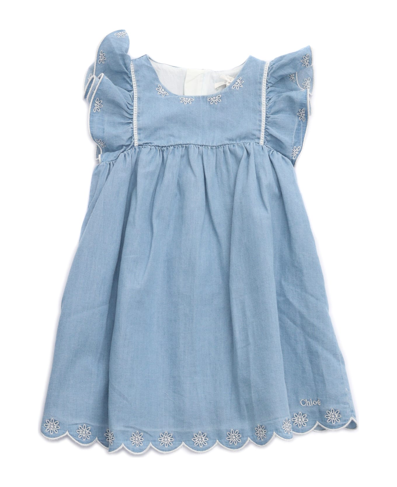 Set of dress and hat in 100% organic cotton light denim. Lined with organic cotton percale. Invisible zip back closure. Flower pattern embroidery detail. Chlo embroidery at front chest. Composition: 100% Cotton Fabric 2 100% Cotton
