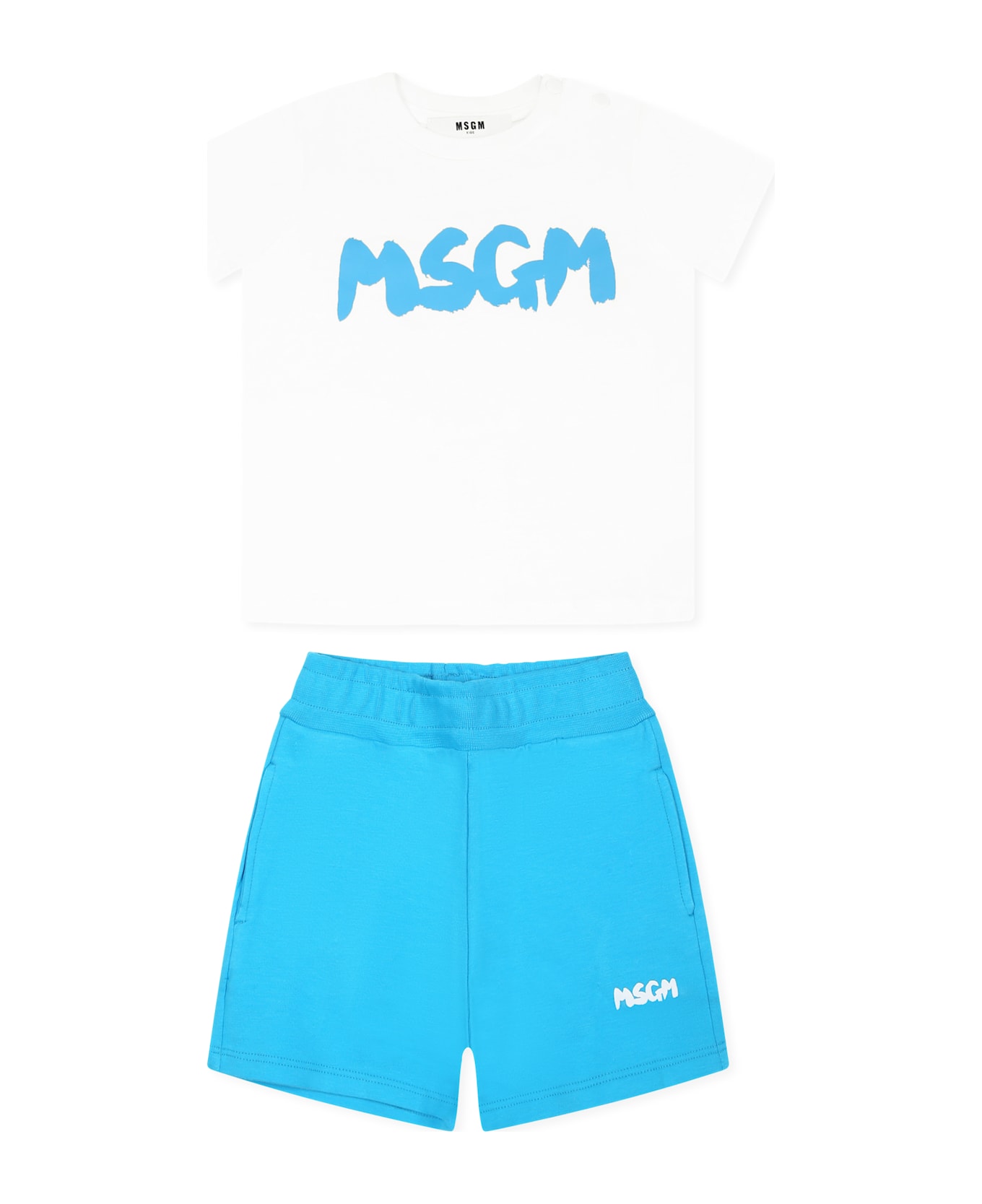 Light blue cotton suit, composed of a t-shirt and shorts. White short-sleeved t-shirt, with ribbed crew neck and snap button fastening on the shoulder; embellished with a light blue logo on the front. Light blue shorts in brushed cotton, with elasticated waist and side pockets; embellished with a white logo on one leg.