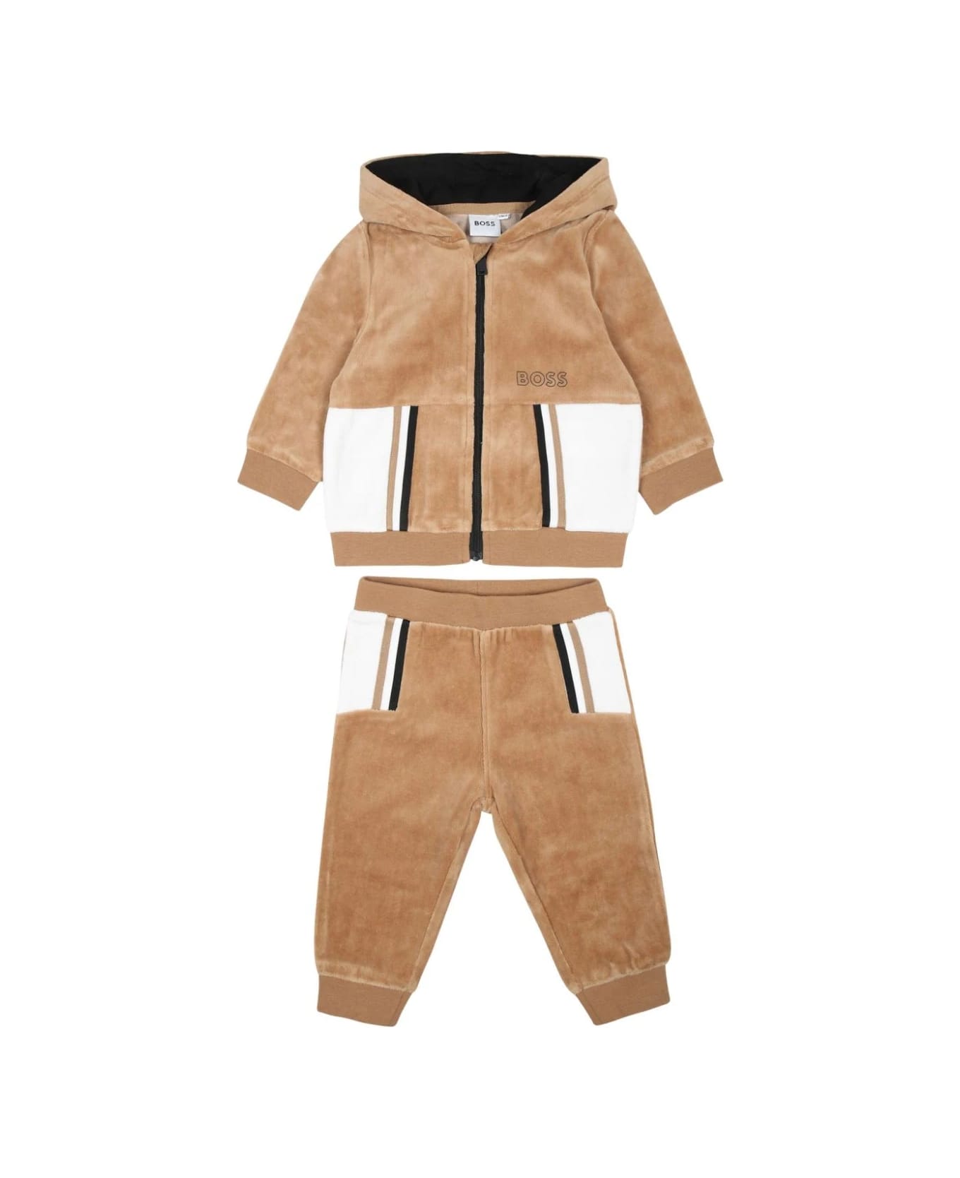 beige misto cotone velluto chiusura frontale con zipGiacca cappuccio maniche lunghe stampa con logo sul petto dettaglio laterale a righe orlo e polsini a costePantaloni vita elasticizzata dettaglio laterale a righe orli alle caviglie elasticizzati