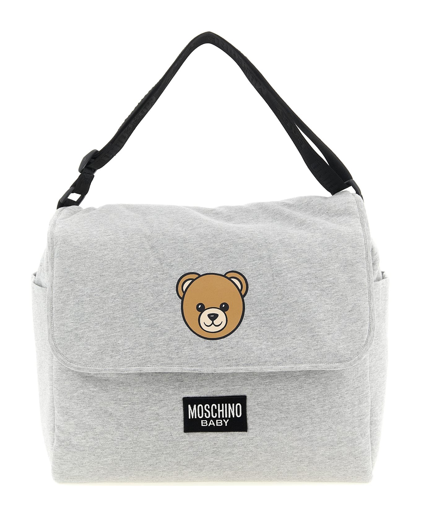 Mélange cotton changing bag, waterproof fabric lining, front logo patch, side pockets, flap closure with velcro and front 'Moschino Teddy Bear' print, adjustable logo tape shoulder strap, foldable padded mattress for changing.