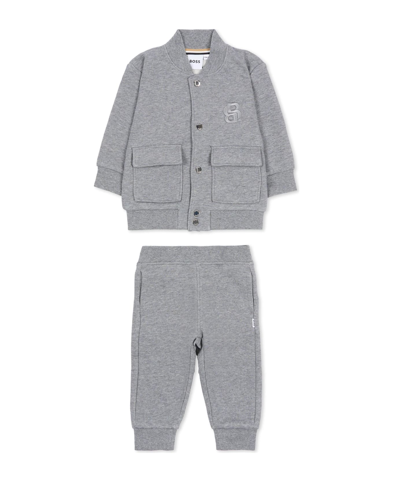 Grey cotton blend suit composed of sweatshirt and trousers. Long-sleeved sweatshirt with a low collar, snap button front, front flap pockets, and ribbed cuffs and hem. Trousers with an elasticated waist, side pockets, and ribbed cuffs. It is embellished with BB logo embroidered on the chest.
