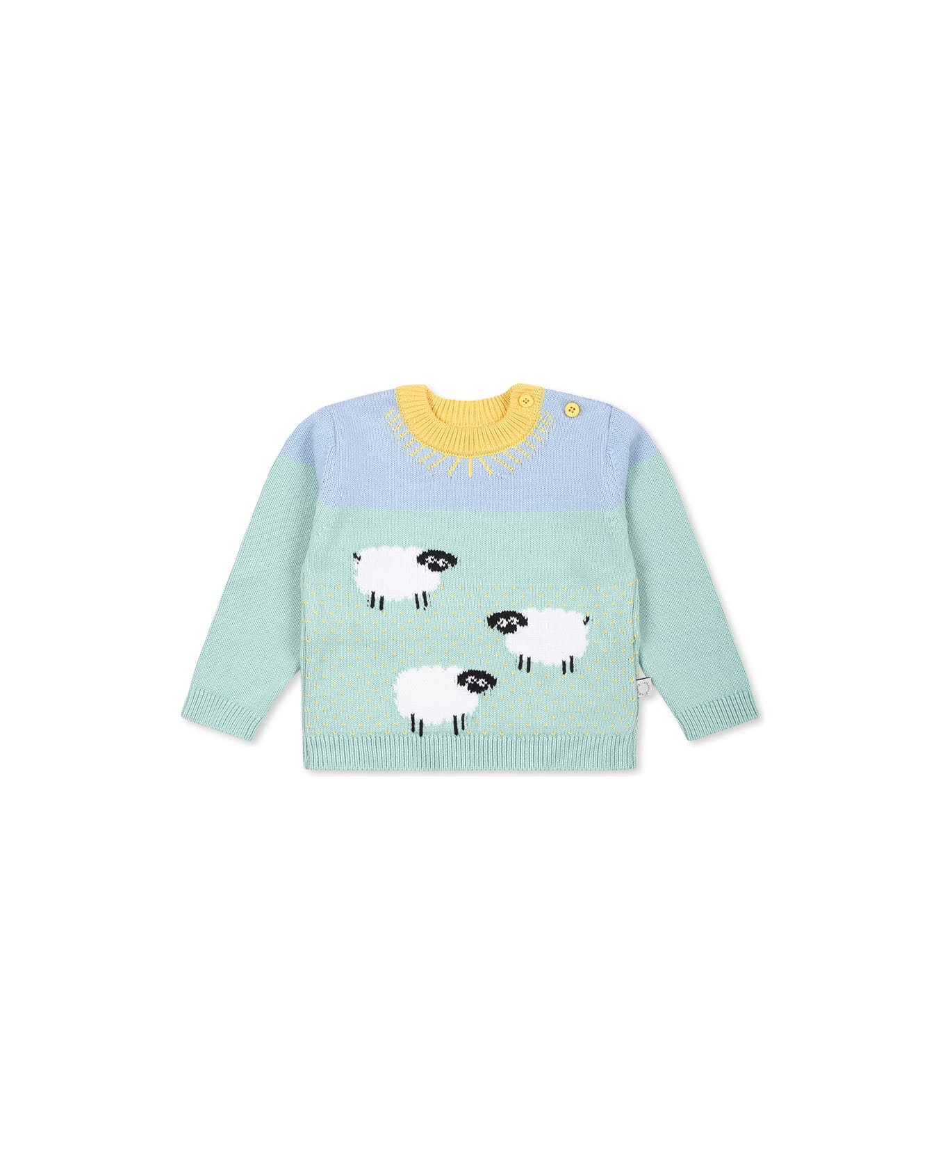 Green sweater in GOTS certified organic cotton, long sleeves, with ribbed crew neck, cuffs and hem and snap button fastening on the shoulder. It is embellished with sheep on the front.