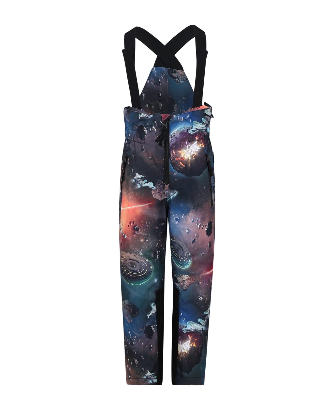 Black waterproof snow suit, with front closure with zip, elasticated waist, elasticated and adjustable braces, side pockets with zip, ankles with elastic, fastening bands. It is embellished with all-over space print and logoed patch on the side; it is made from recycled content.