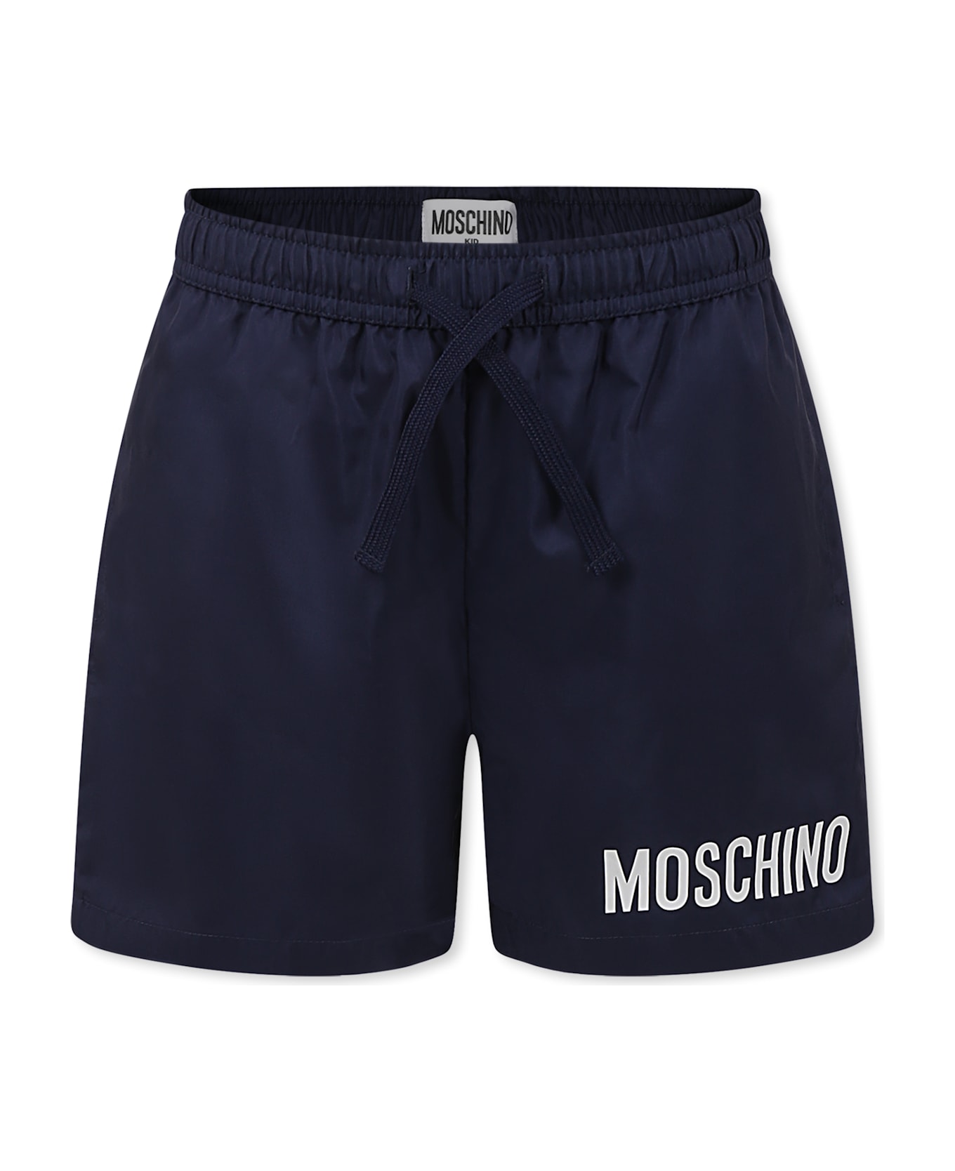 Moschino Kids blue swim shorts with elastic waist, drawstring and side pockets. It is embellished with white logo on one leg.