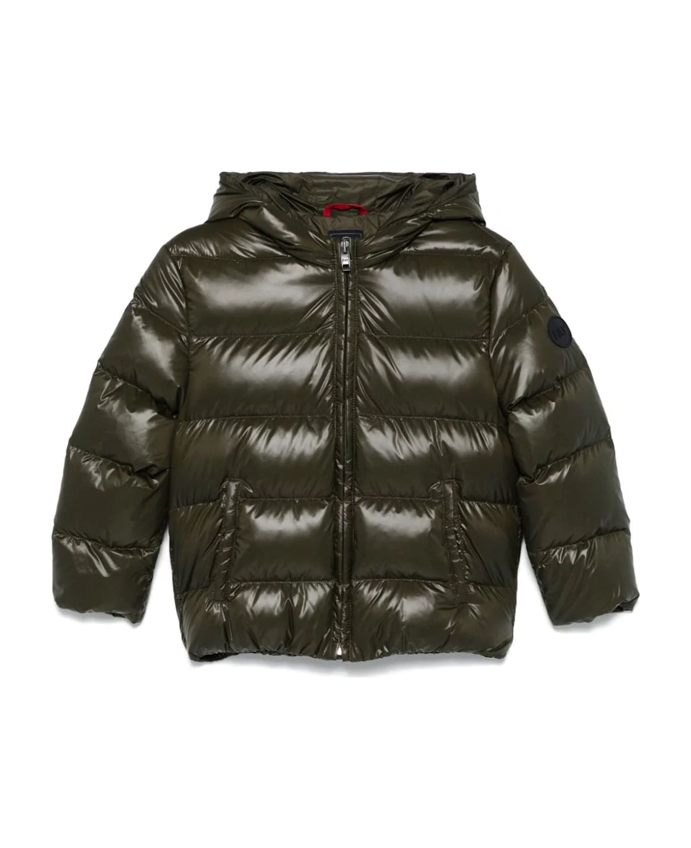 green polyamide jacket goose down padding quilted design padded design front zip closure hood rubber logo detail long sleeves elasticated hems two side pockets with zip full lining elasticated hem