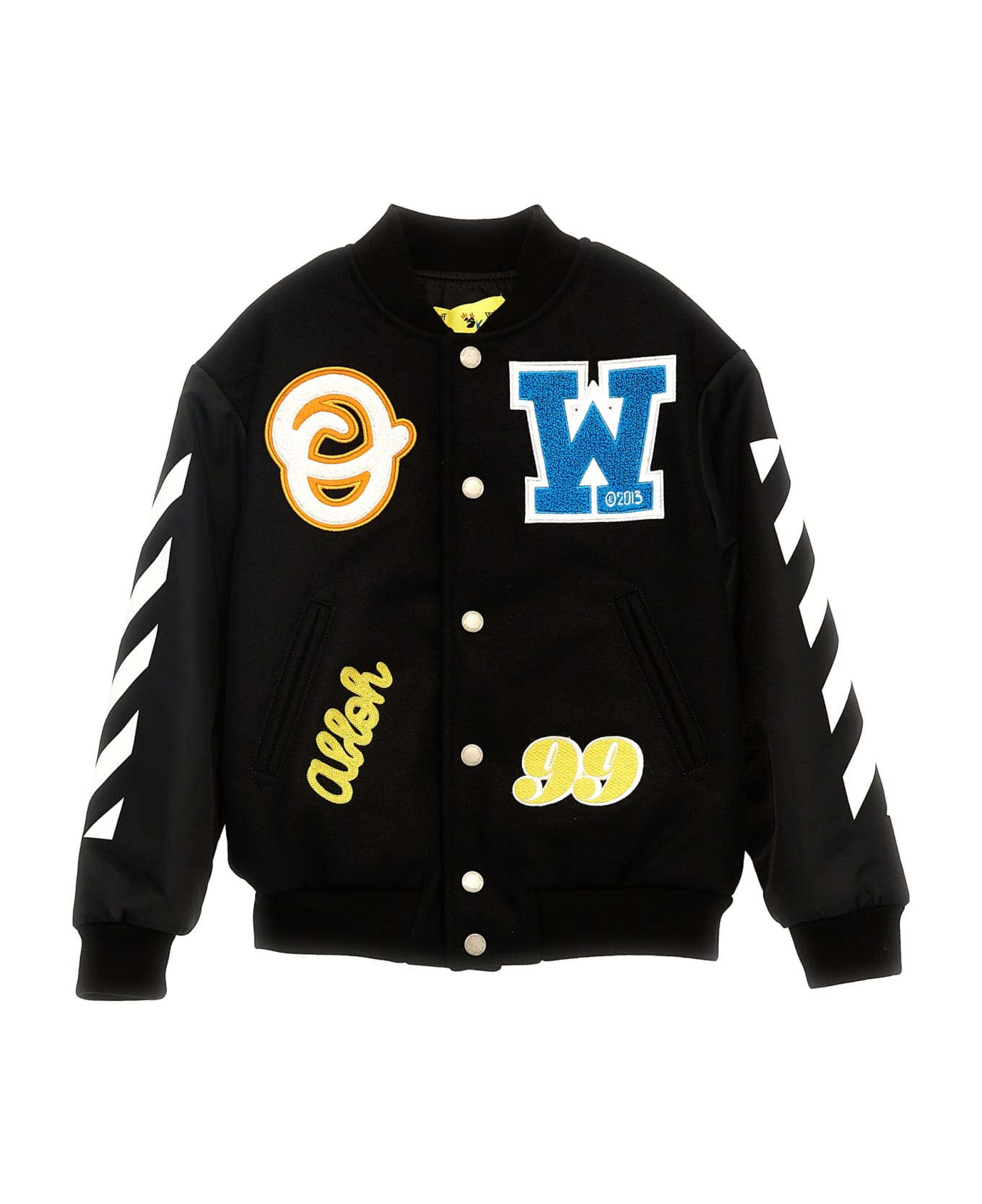 'OW Patch' wool blend bomber jacket with all-over patches, post embroidered logo, button closure, mylon sleeves with knit cuffs, pockets. Composition: 80% wool, 20% polyamide