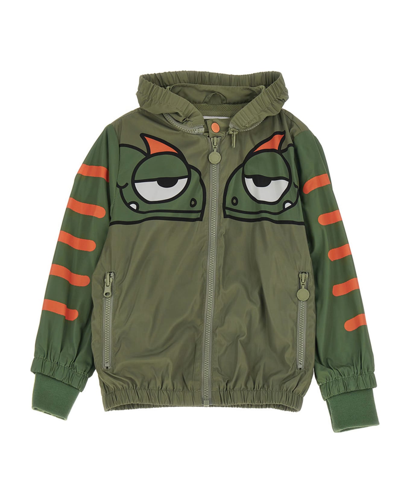 Removable nylon hooded jacket with print, pockets, and long knitted cuffed sleeves. : This product is made in recycled polyester.