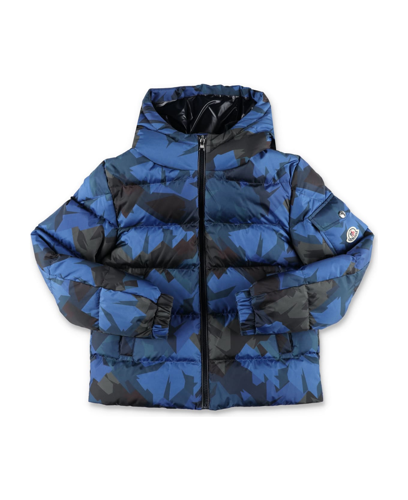 Stevens Down Jacket By Moncler. Featuring: Stand Collar Hooded Front Zip Closure Long Sleeves Buttoned Patch Pocket With Logo Patch On Left Sleeve Side Snap Buttoned Pockets Puffed Elasticised Cuffs