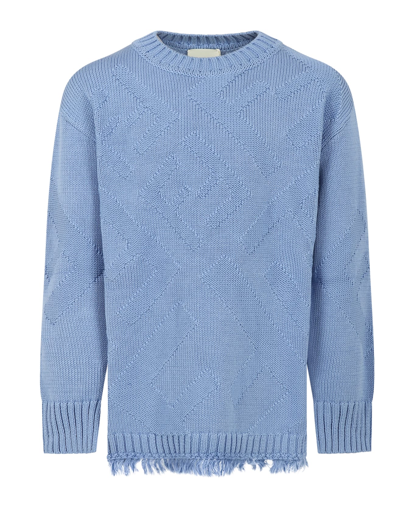 Light blue cotton sweater, with long sleeves, ribbed crew neck, cuffs and hem. It is embellished with fringes on the bottom and with an all-over embroidered logo.