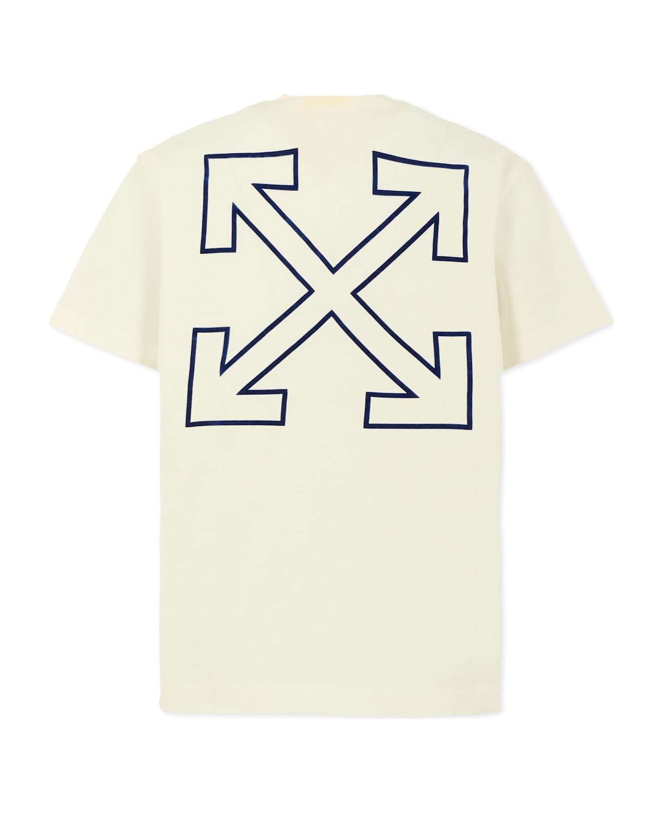 White cotton T-shirt with short sleeves and a ribbed crew neck. It is embellished with iconic blue velvet arrows on the back and logo on the chest.