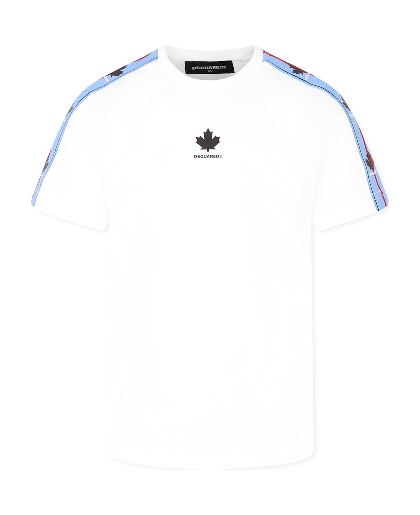 White cotton t-shirt, short sleeves, with ribbed crew neck and blue bands with maple leaf and logo on the sleeves. It is embellished with logo and maple leaf on the front.