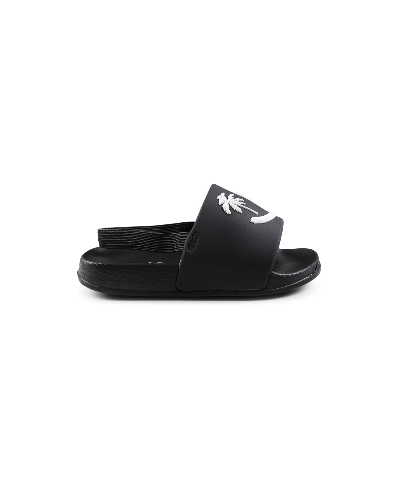 Black slippers with rubber sole and elastic strap on the heel. They are embellished with white smile and palm trees, on the front.
