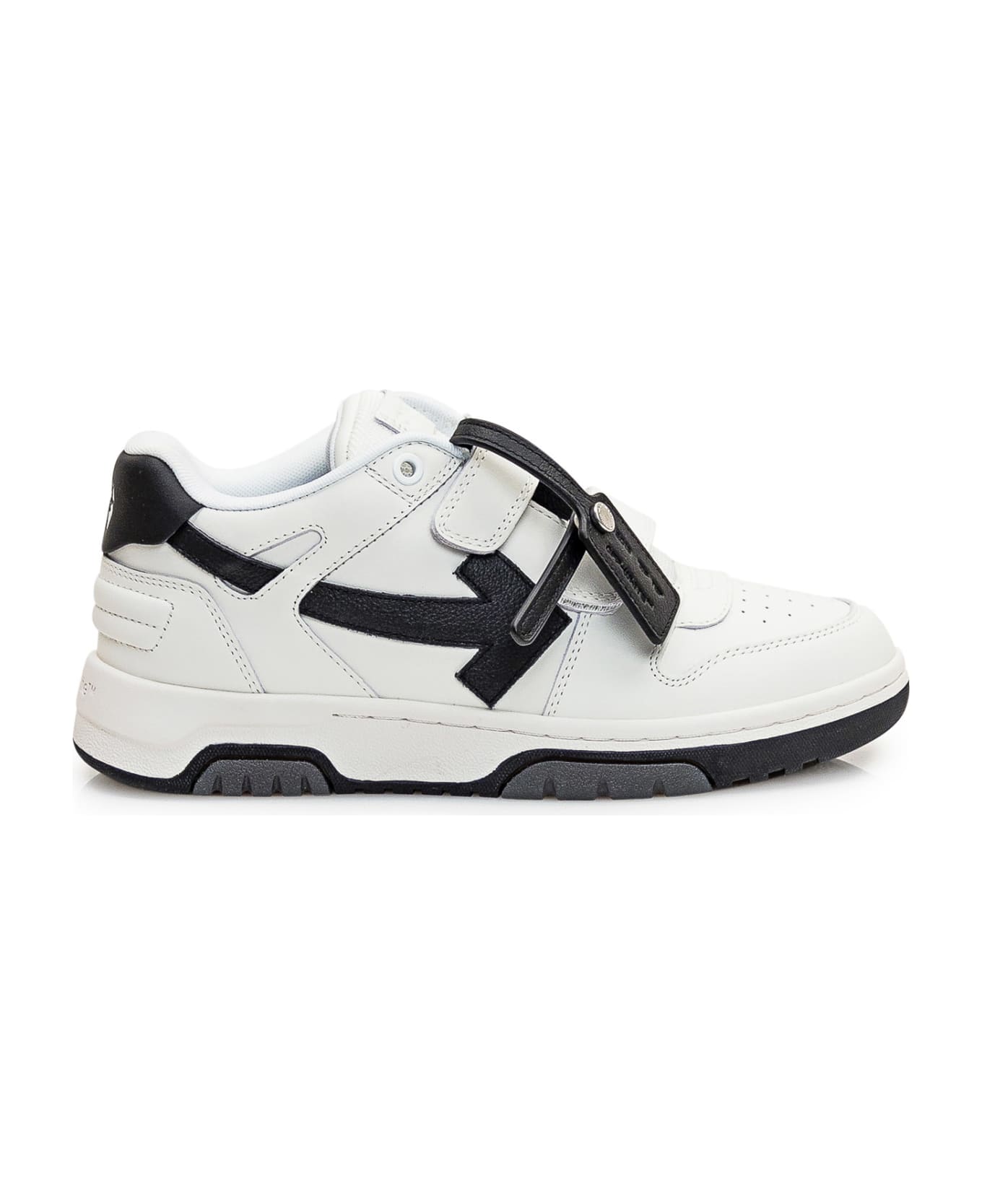 White leather sneaker. Strap-on closure. Black side Zip-Tie label. Black side arrows. Logo on heel and tongue. Composition: Outside: 100% Leather, 100% Fabric Lining: 100% Fabric Sole: 100% Rubber