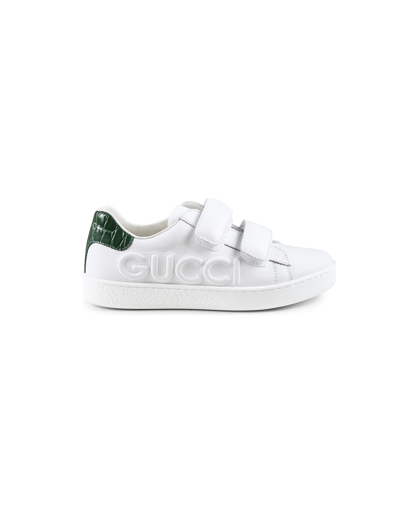 White Ace sneakers from the Italian luxury brand Gucci Kids, made of soft leather. They feature a rubber sole, a comfortable closure with hook-and-loop closure, a round toe and a green leather detail on the back. They are embellished with an embossed Gucci logo on the side.