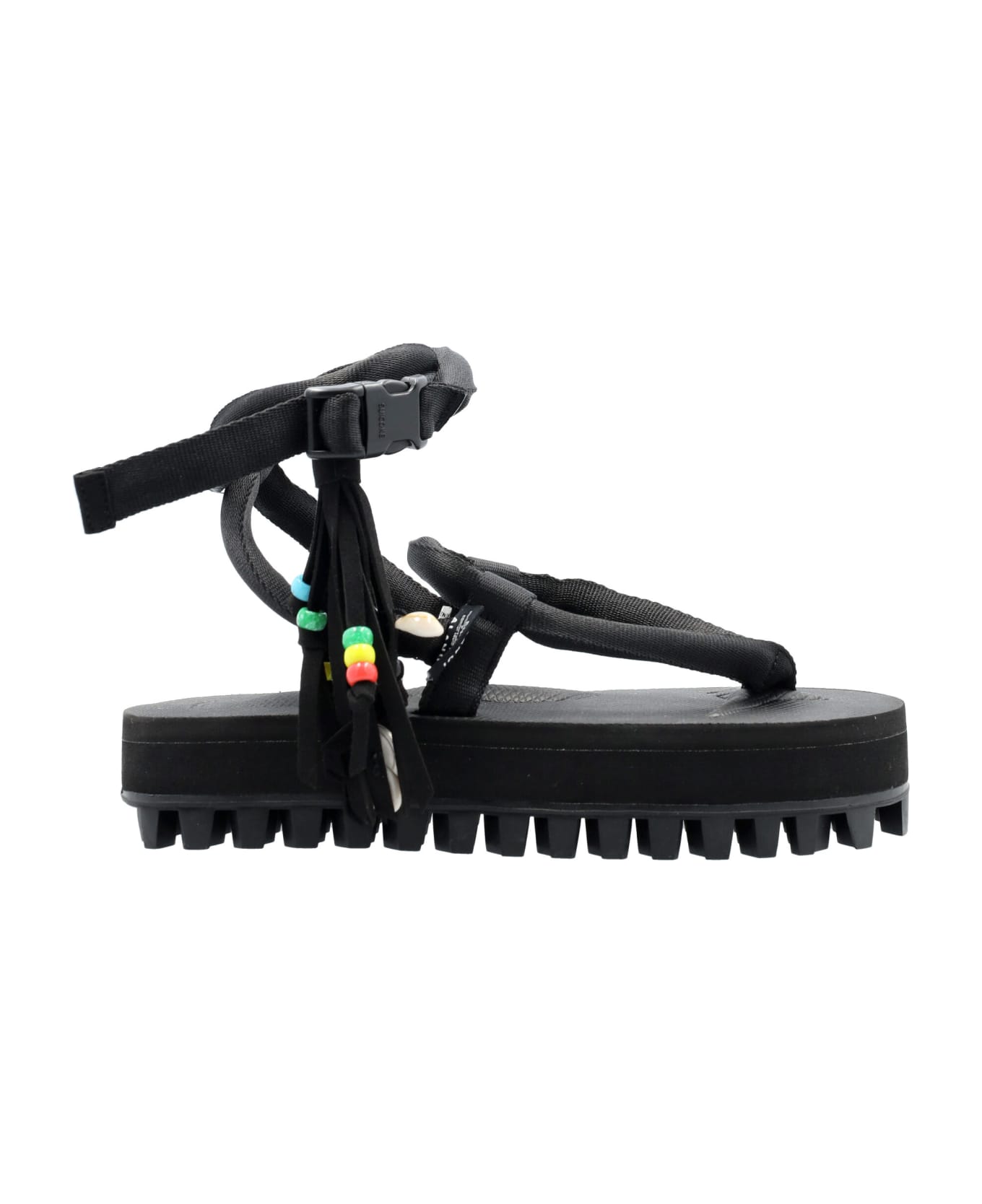 Embassy Black Gut Suicoke Sandals By Alanui X Suicoke. Featuring: - Thong Design - Adjustable Ankle Strap With Buckle Closure - Tassles Customized With Recycled Beads, Seashells And The Brand's Recognizable Saint Cristopher Medal - Round Toe - Black Treaded Rubber Platform Sole