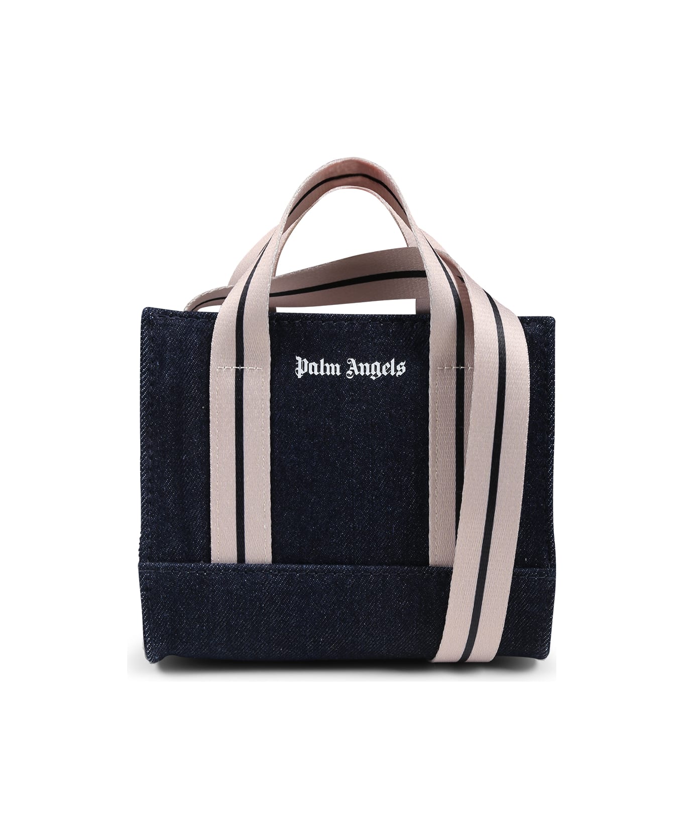 Denim bag with handles, top zip closure and shoulder strap. It is embellished with front logo.