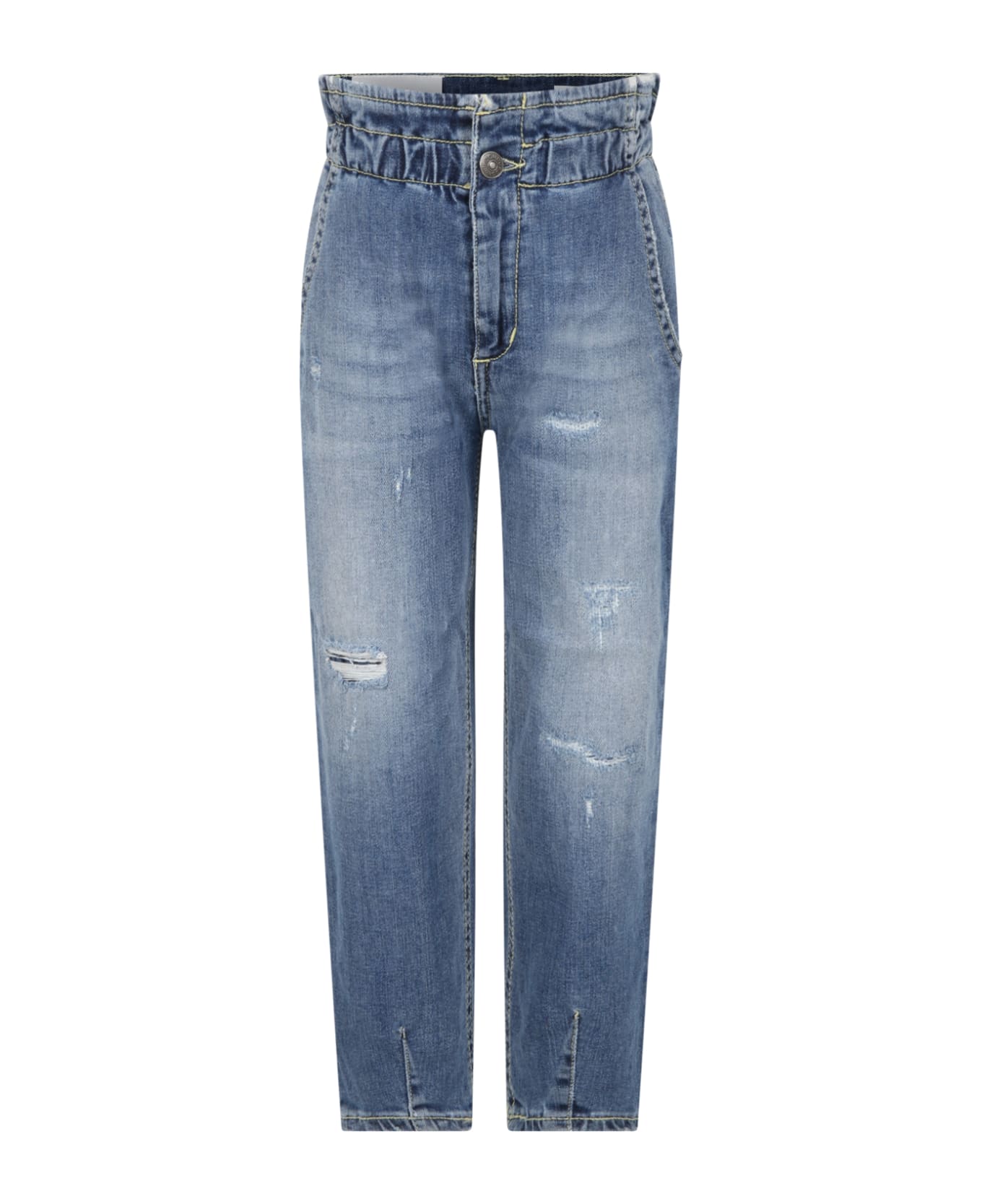 Denim blue jeans with elasticated waist, side and back pockets and button and zip fastening on the front. They are embellished with fake rips and logo patch on the back.