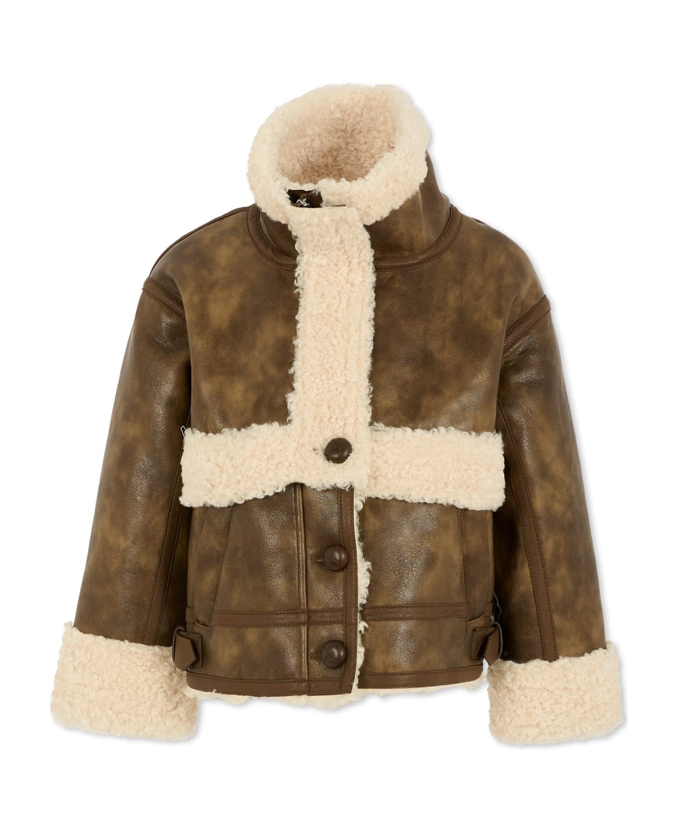 Brown faux fur that converts into a cropped jacket, featuring a faux shearling lining, long sleeves, a high collar, a front button closure, a concealed zip, side pockets, and ivory shearling details. It is embellished with an embroidered logo on the back.