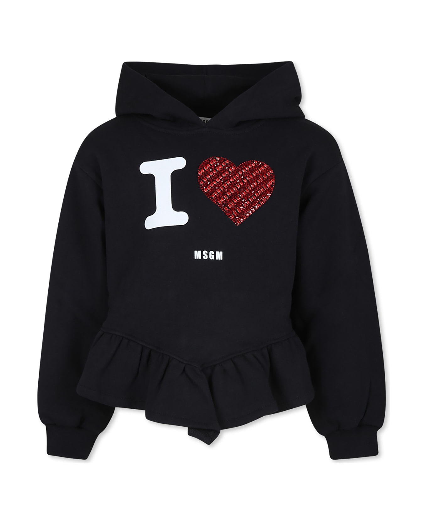 Black sweatshirt in fleece cotton, long sleeves, with hood, flounce at the bottom and ribbed cuffs. It is embellished with logo and crystal heart with rhinestone and beads on the front.