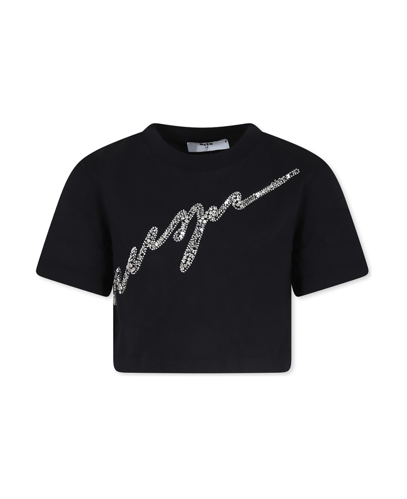 Black cotton crop t-shirt, with short sleeves and ribbed crew neck. It is embellished with a front logo with rhinestones, sequins and beads, with a printed logo on the back.