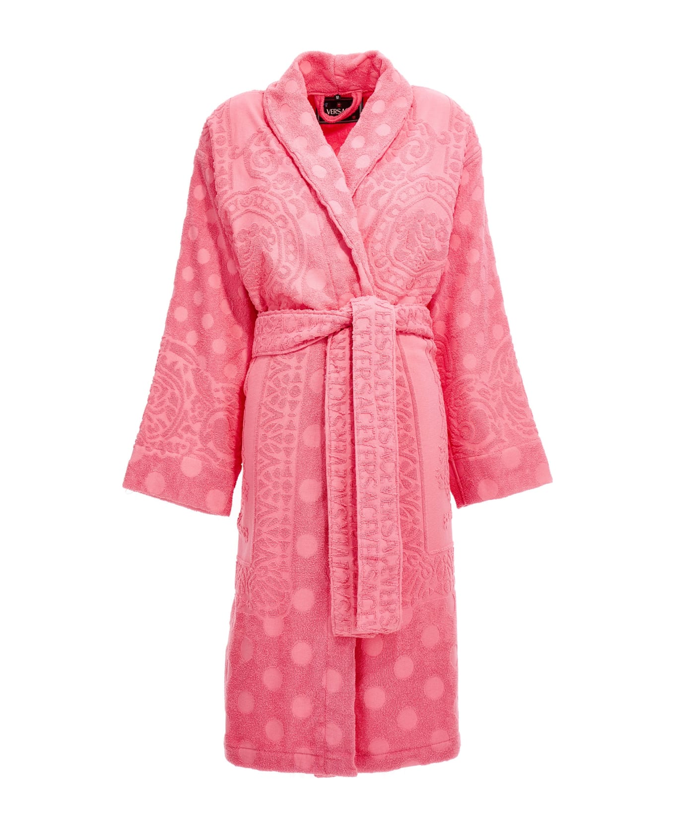La Vacanza cotton terry cloth caspule bathrobe with tone-on-tone 'Seaqué Baroque Polka Dot' pattern and a belt to be tie at the waist. Composition: