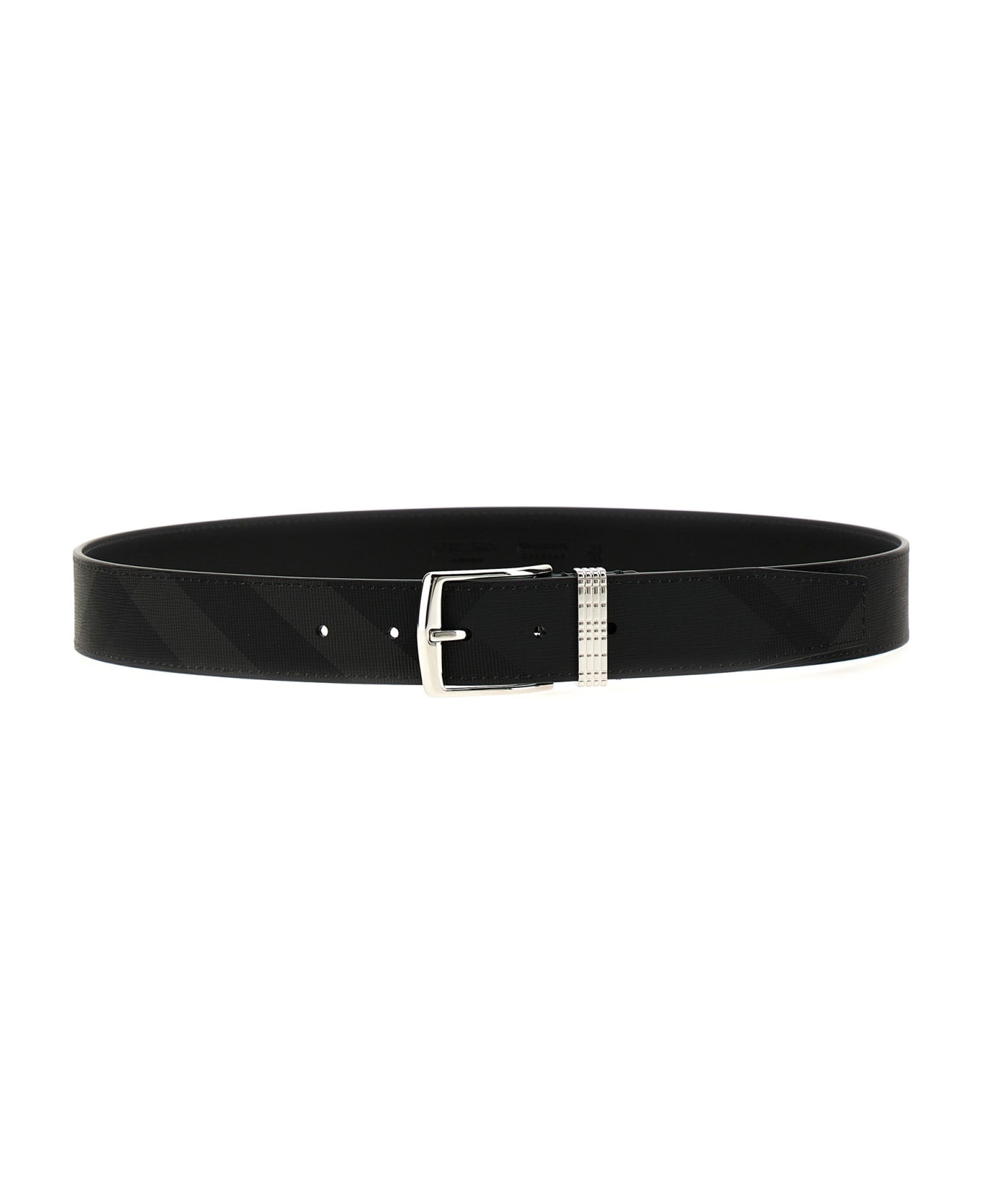 Leather and check print fabric belt, palladium-plated buckle and engraved Check loop. Composition: 70% polyurethane, 30% cotton