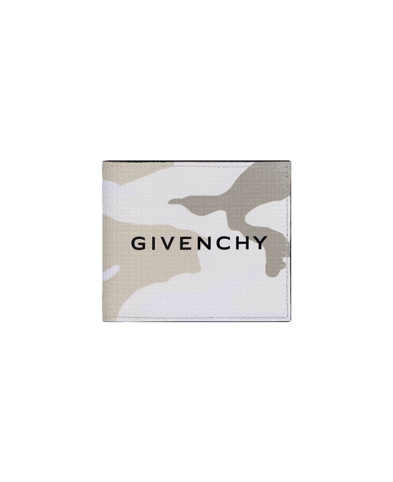 GIVENCHY men's wallet made of calf leather embossed with a 4G camouflage printed motif. Model characterized by a foldable design, two compartments for banknotes, eight compartments for credit cards, black GIVENCHY signature printed on the front and silver GIVENCHY signature embossed on the inside.