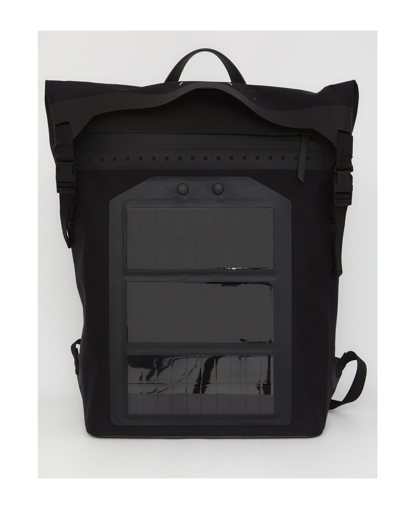 Mackintosh backpack in black fabric with three solar panels on the front and padded back. It features top handle, adjustable shoulder straps, fold-over design with four stitches detail and buckle closure, one wide main interior compartment and one front zip pocket with USB cable.