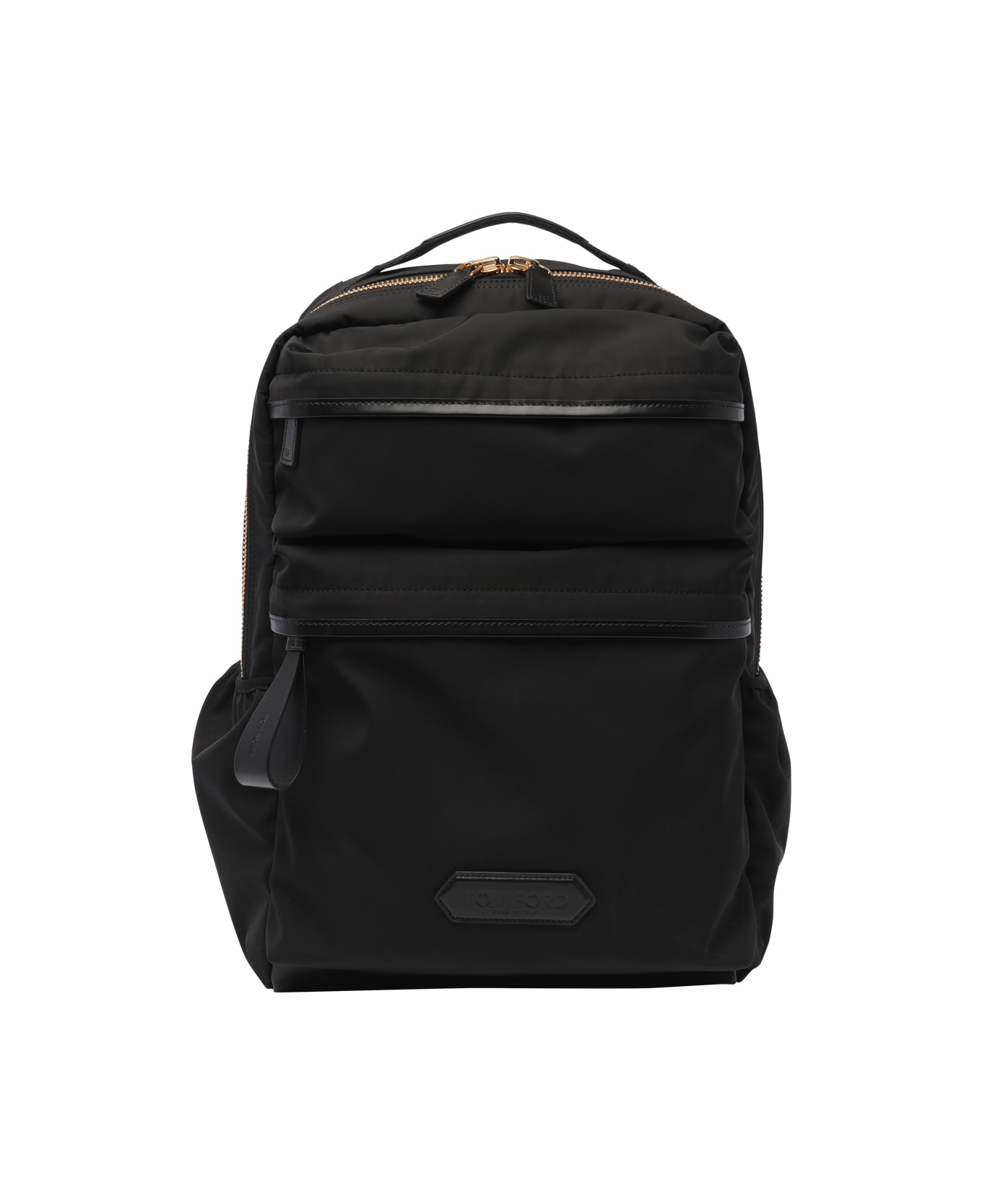 Tom Ford black recycled nylon backpack, logo on front, zip closure, inner pocket for laptop, two open e one zip pocket, two external zip pockets, one lateral with zip and two open, one handle, adjustable shoulder strap