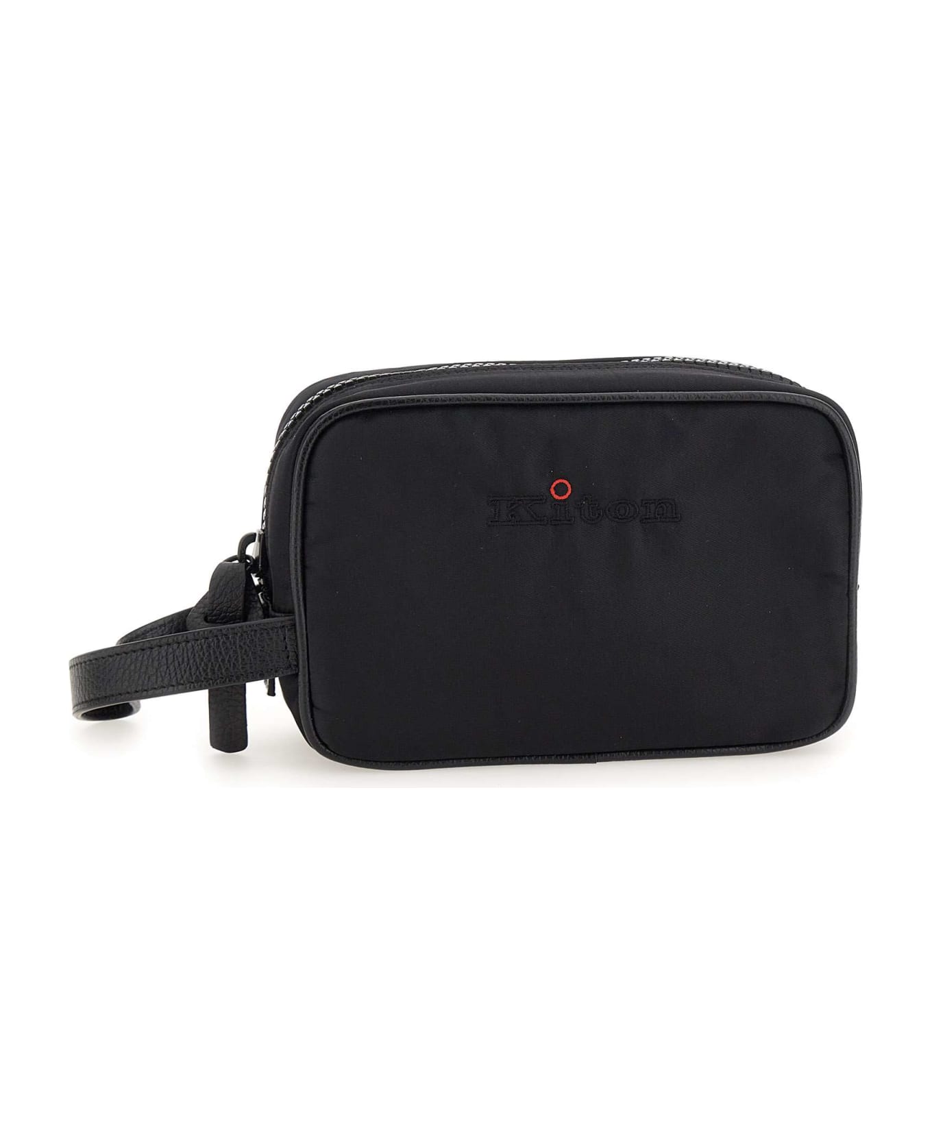 Kiton men's clutch bag, black colour, in resistant and water-repellent technical fabric, front logo, top fastening with zip,side handle, red internal lining, internal pocket. Dimensions: length 20cm, height 13cm, depth 9cm. Fabric pouch included. Made in Italy.