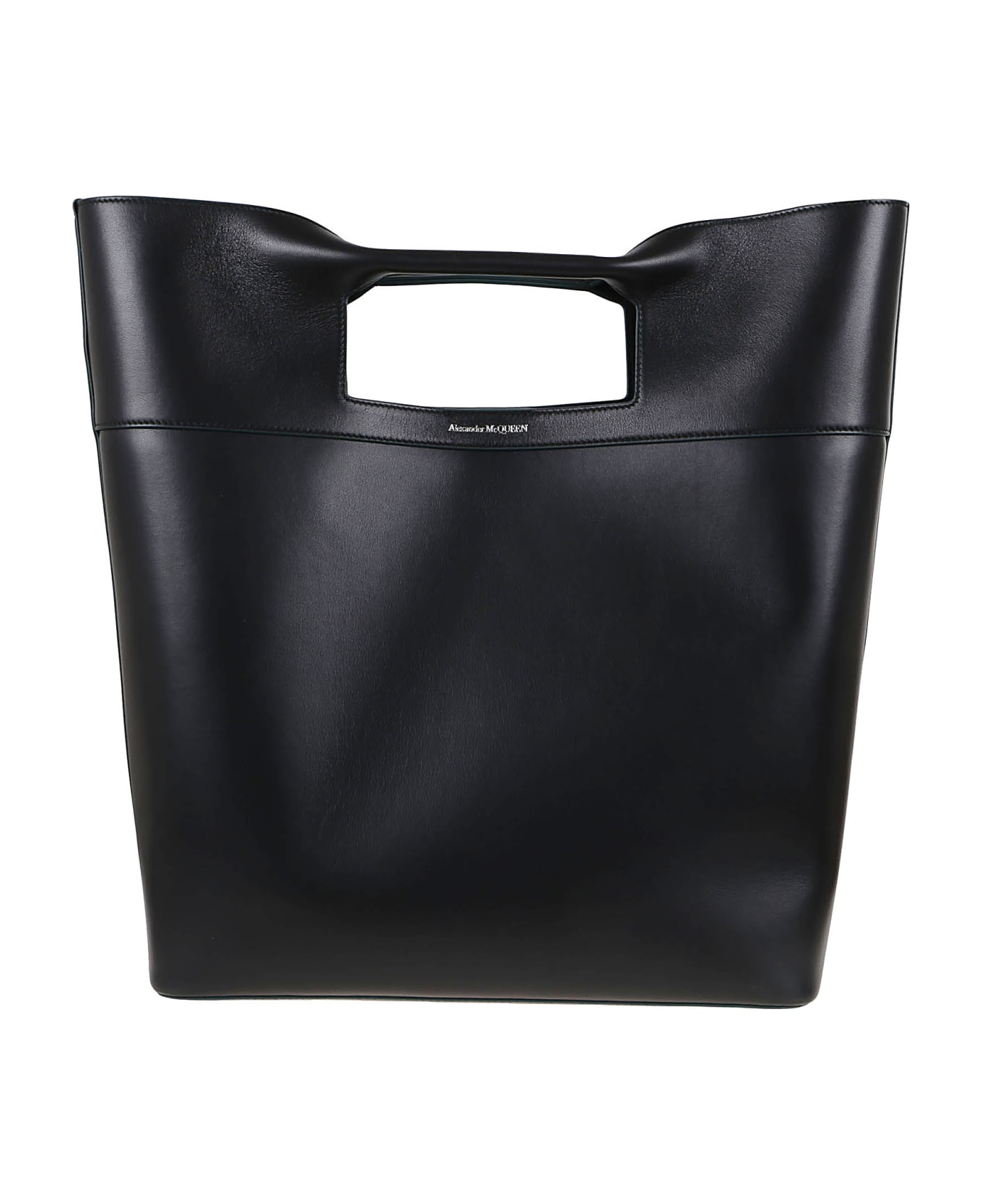 leather logo print tote bag from Alexander McQueen featuring black, calf leather, smoothing finish, stripe detailing, logo print to the front, bow detailing, two top handles, single top handle and main compartment.