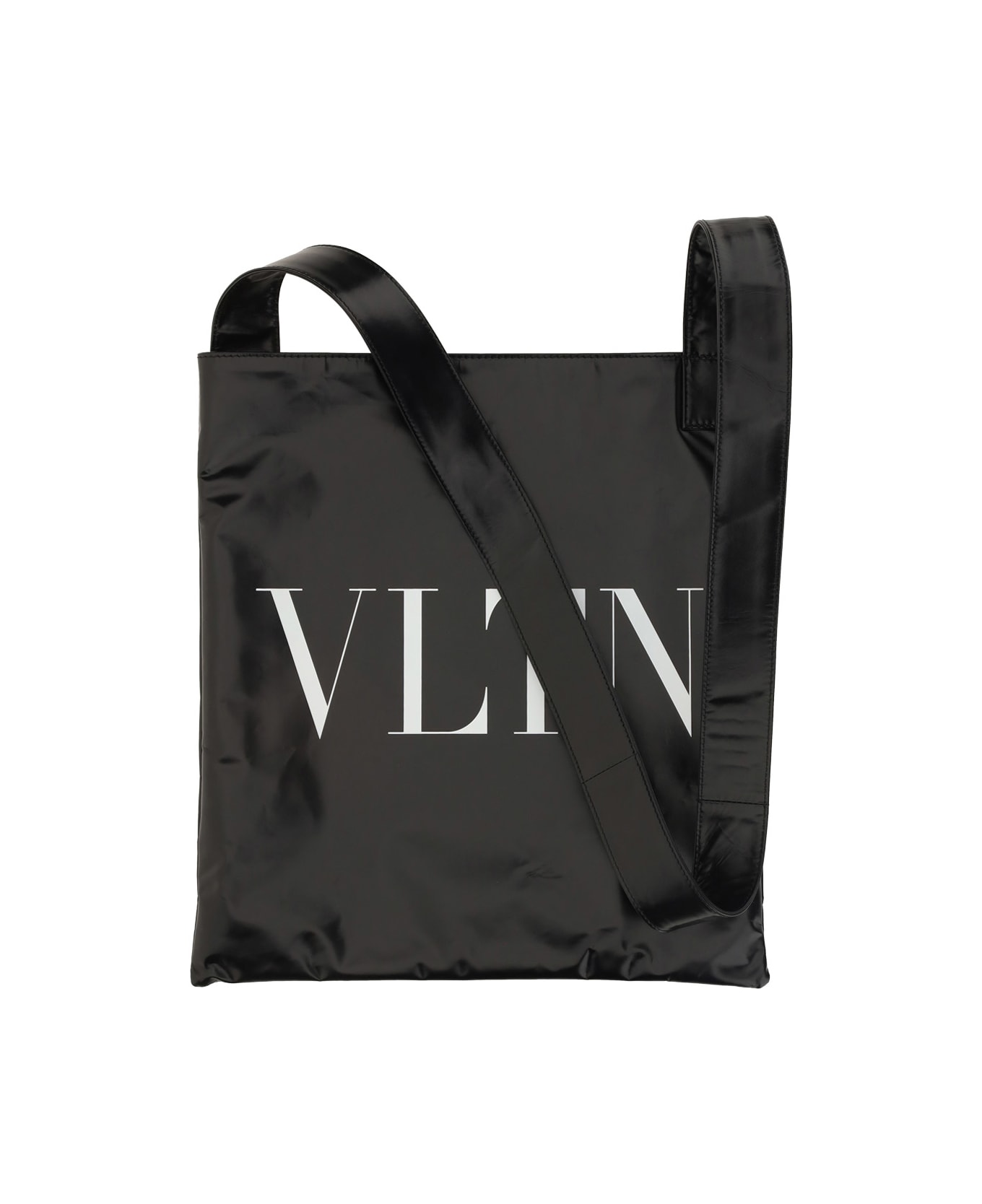 Calfskin soft tote bag by valentino garavani, long flat shoulder strap, soft and shiny leather design, iconic brand monogram printed in contrasting block letters on front.