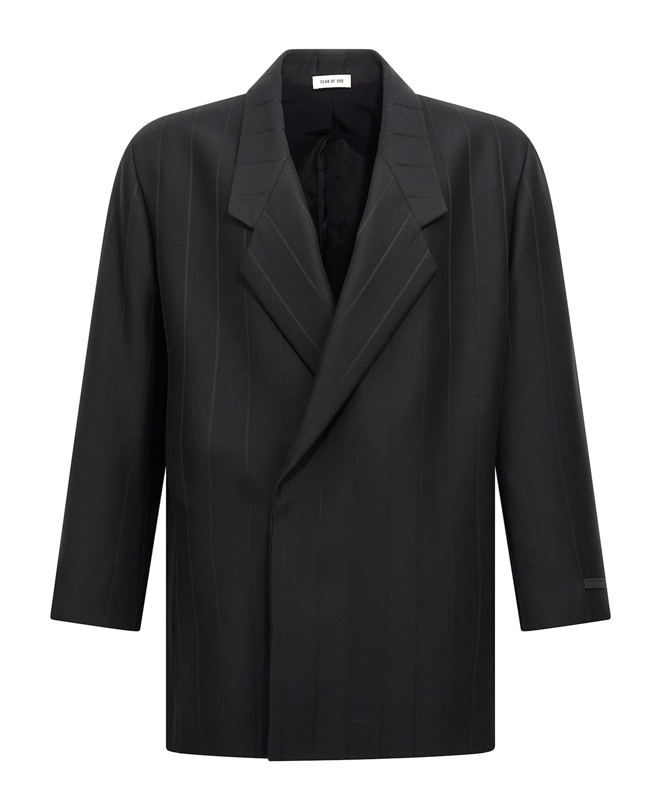 'Relaxed' virgin wool and viscose blend blazer with jacquard pinstripe detail, iridescent cupro lining, double-breasted style with button closure, pockets, long sleeves with leather logo patch, padded shoulders.