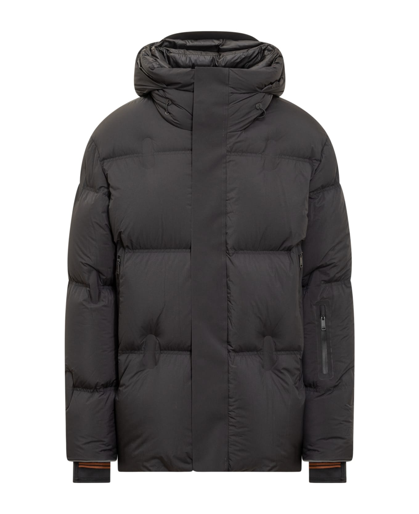 Black long sleeve down jacket. Drawstring hood. Front zip and button closure. Side pockets and sleeves. Composition: Outside:, 100% Polyamide Inside:lining:, 100% Polyamide Padding:, 90% Piumio, 10% Feather