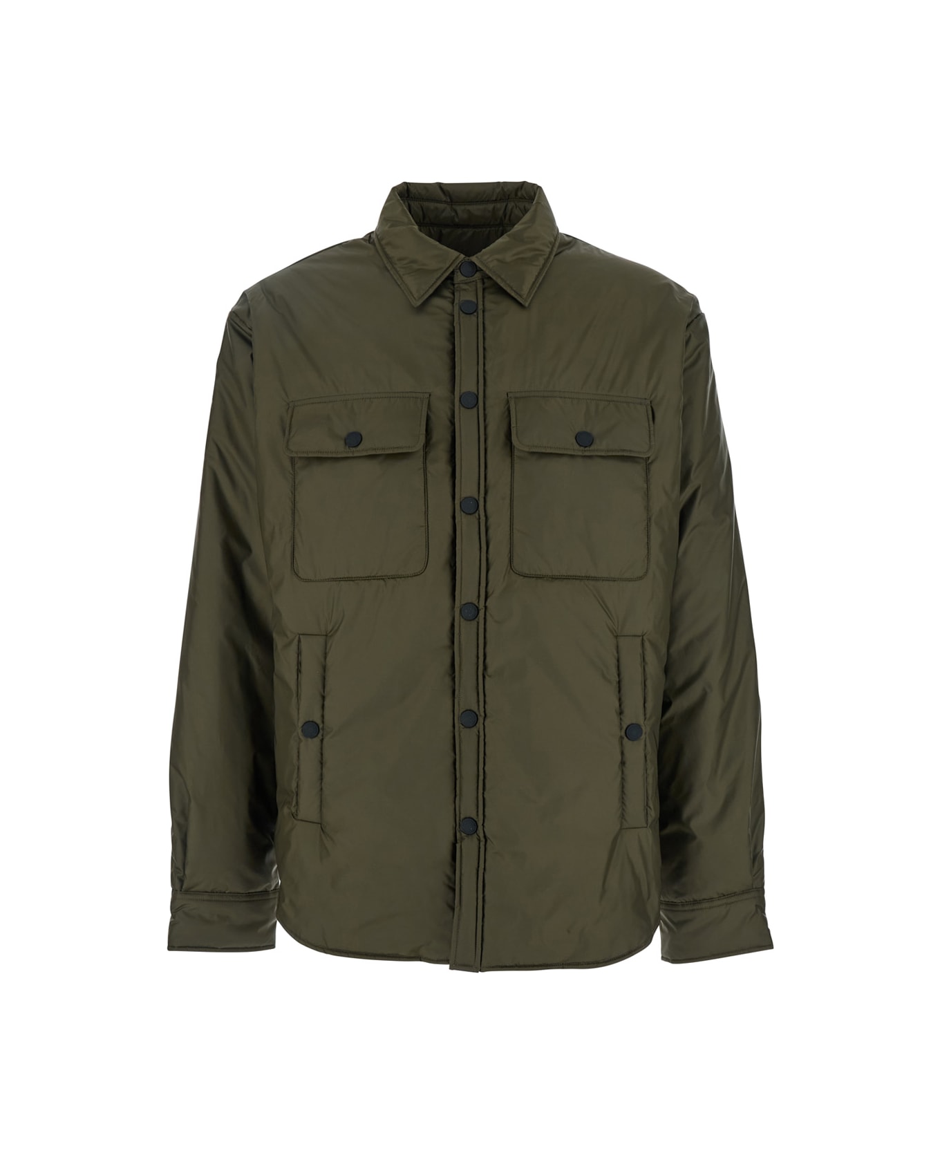 Jacket Green Pointed collar Long sleeves Front button closure Two flap pockets on the chest Two side button pockets Application logo on the back Cuffs with button Down filled Tech fabric Regular fit