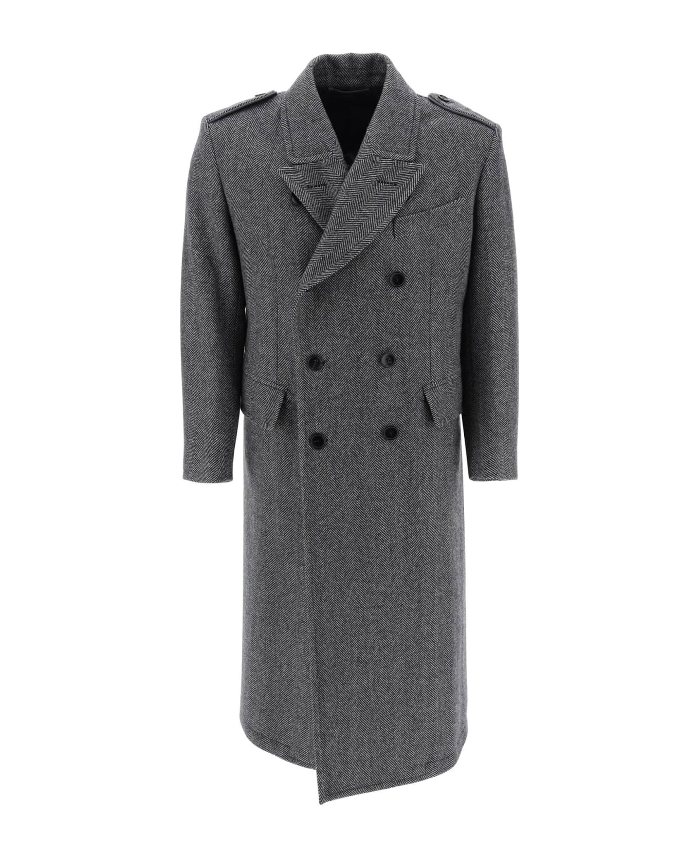 Tom Ford officer coat crafted in pure virgin wool Herringbone fabric with double-breasted design and horn-button closure. It features peak lapel, epaulettes on the shoulders, chest welt pocket, jetted pockets with flap, inverted pleat, martingale and buttoned vent on the back. Partially lined and provided with pockets on the inside. Flared cut with structured shoulders and calf length. The model is 187 cm tall and wears size IT 48.